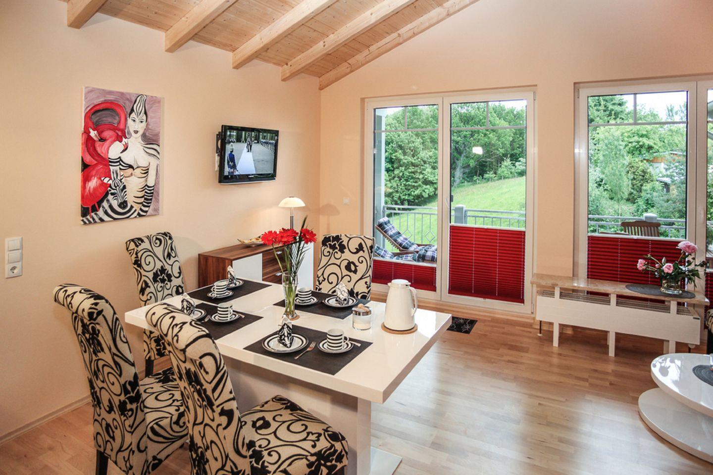 WOHNEN // Wohnraum mit Essbereich, bequemer Couch, Sessel, Flachbild-TV, bodentiefen Fenstern, 2 Balkonen (Südbalkon und Westbalkon) ++