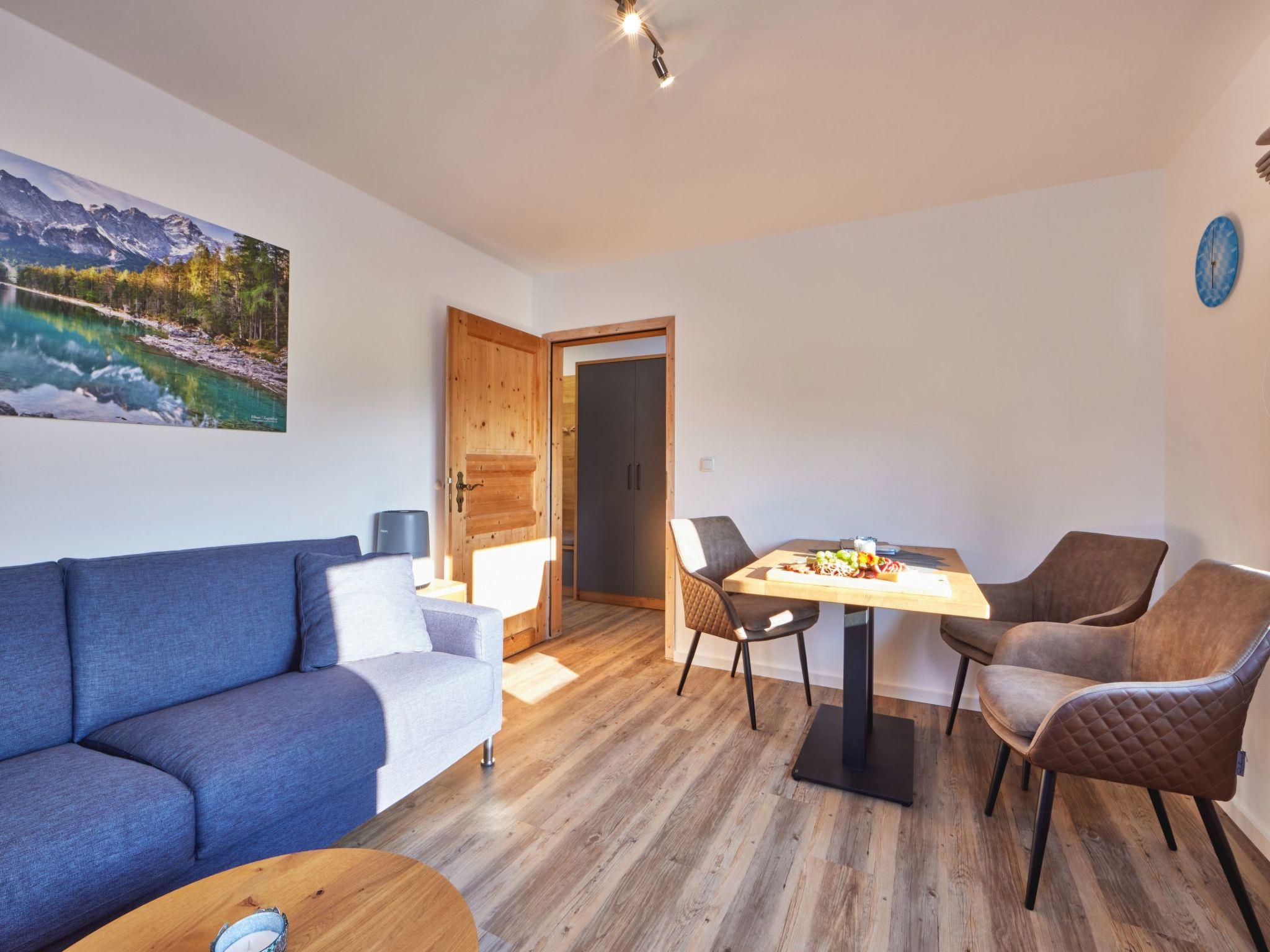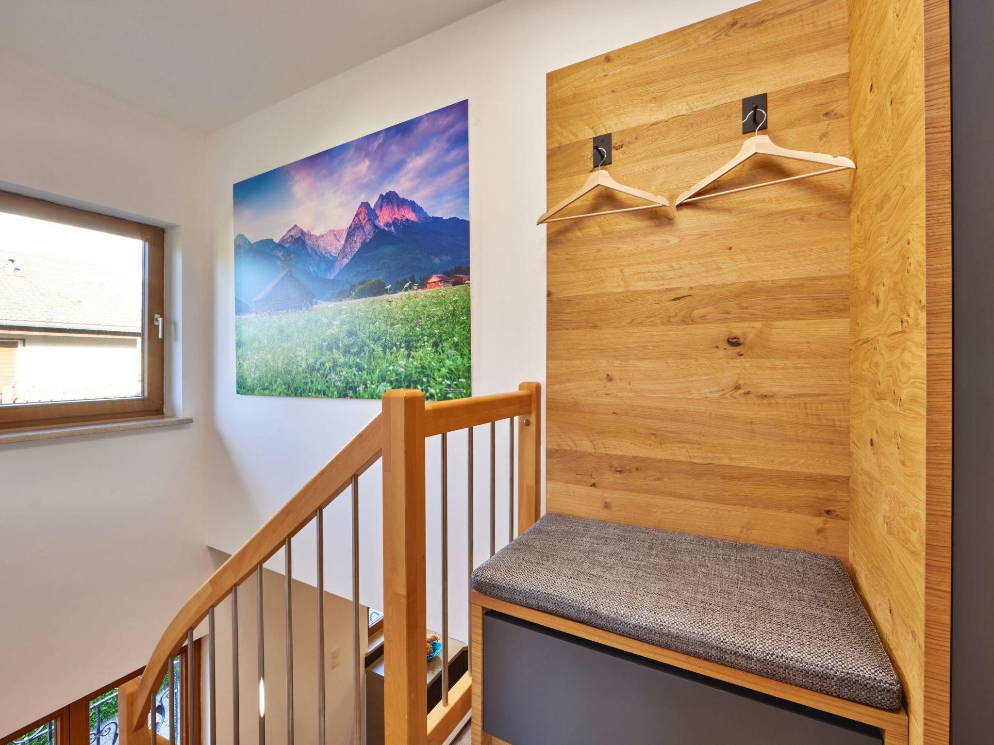 The large, fully covered balcony accessible from the living-dining area offers a panoramic view over the meadows along the southern outskirts and the Werdenfelser and Tyrolean mountains.