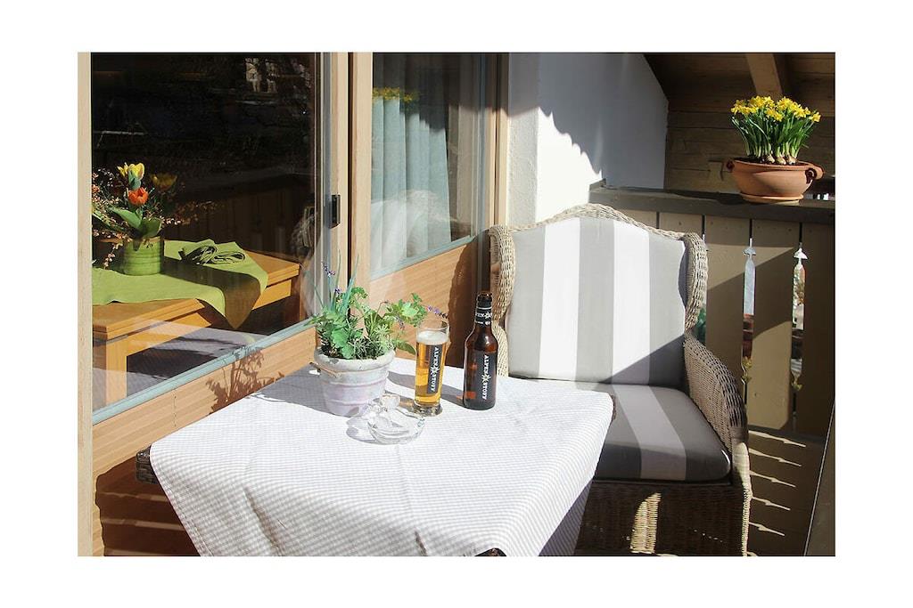 The apartment has one bedroom for two people, a living room with a sofa, armchair, and table, a TV, radio, and a Telekom hotspot. The modern kitchen is equipped with a dishwasher, a ceramic hob, an oven, a microwave, a coffee machine, a kettle, a toaster, and comfortable seating, so you can enjoy the wonderful sunny mountain view even while enjoying breakfast. The bathroom has a walk-in shower/WC, a hairdryer, and a vanity. The built-in closets offer plenty of space for your clothes. The apartment's guaranteed peace and quiet offers the best relaxation.