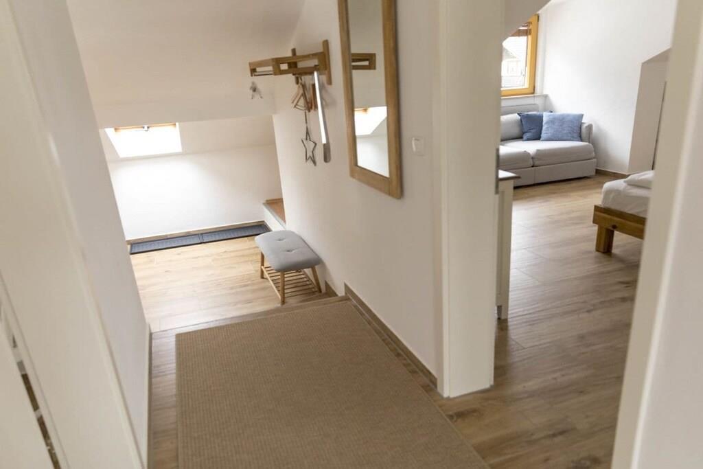 The completely renovated attic apartment (100 m²) features two bedrooms with double beds (180x200 and 160x200) and an optional sofa bed for two people; two bathrooms, a hallway, and an open, light-filled living room with a dining area and a large kitchenette. The unobstructed panoramic view of the entire Wetterstein Mountains, including the ski slopes on the local mountain, over the Alpspitze to the Zugspitze, is first-class. The open kitchen is equipped to a high standard: dishwasher, induction hob, microwave, oven, freezer, WMF fully automatic coffee machine, electric citrus juicer, toaster, etc. The wood-carved dining table seats up to six people. All-round comfort: relaxing couch, smart TV, Bluetooth system, high-speed Wi-Fi, balcony, gas grill, parking space, ski storage, washing machine, and much more.
