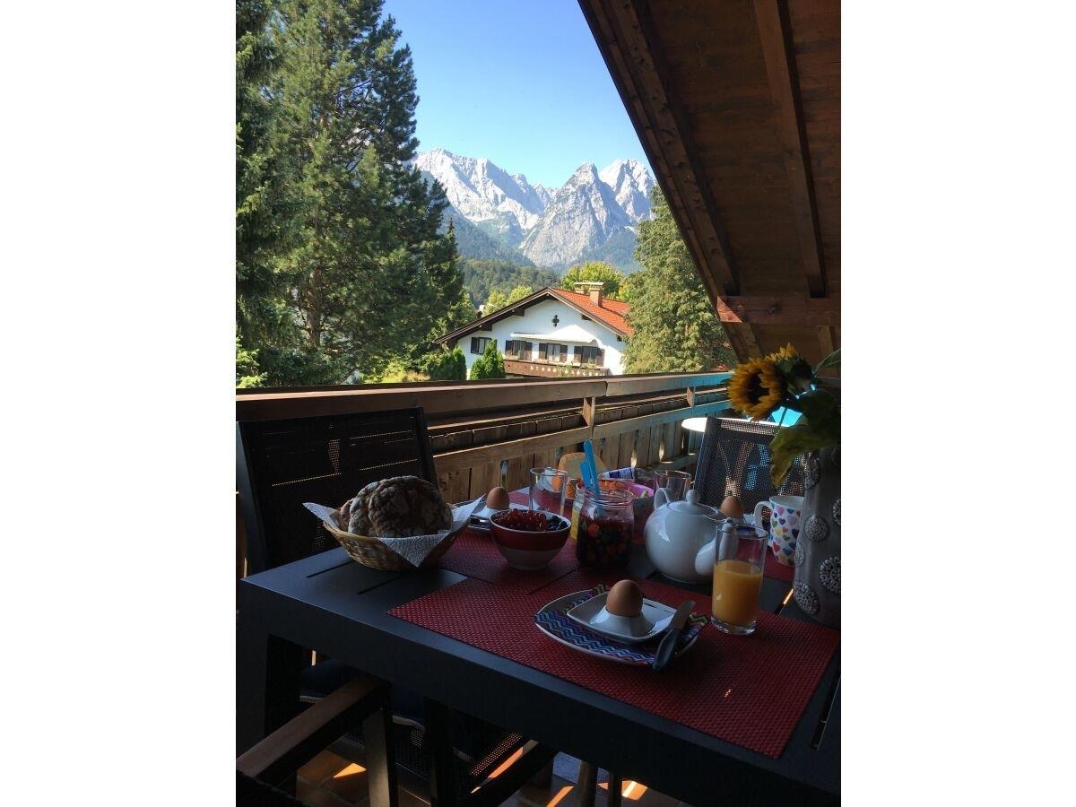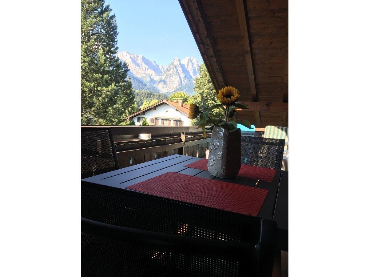 Genießen Sie vom Liegestuhl aus die herrliche Aussicht auf das umliegende Bergpanorama von den beiden geräumigen Balkonen (Süd/Ost- (Zugspitzblick) und Nord/West-Ausrichtung).