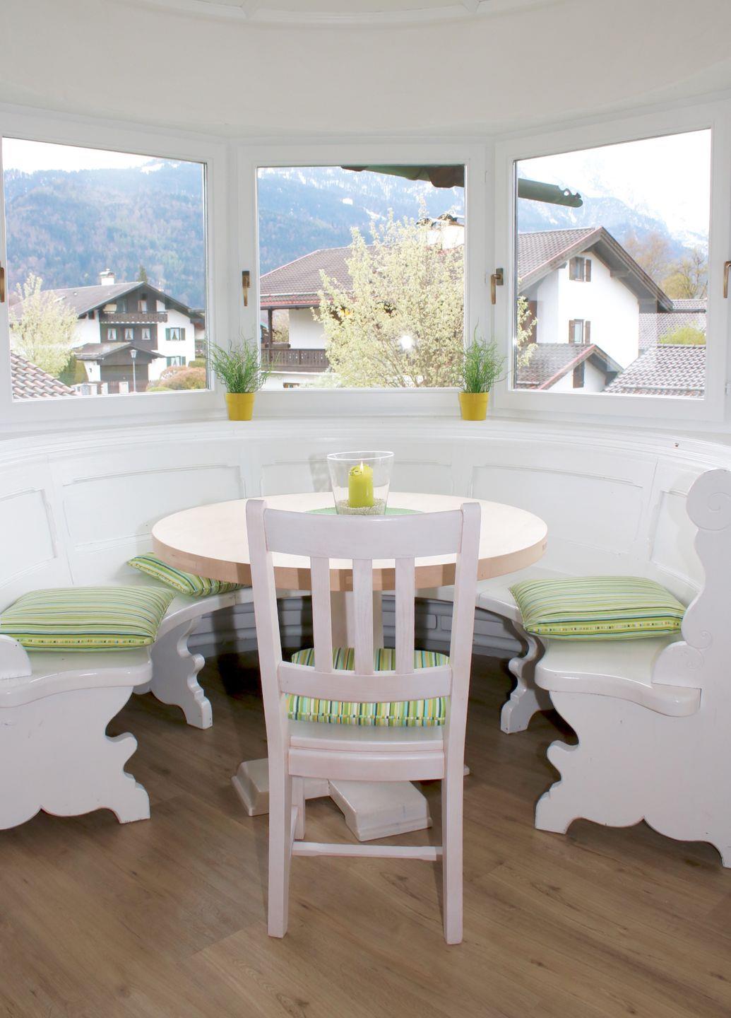 Im 1. OG erwartet einen, ähnlich wie bei einer Maisonette-Wohnung, ein offenes Esszimmer, das über einen großzügigen Esstisch mit Eckbänken und Platz für bis zu 8 Personen verfügt. Die kleine, aber feine Küche befindet sich direkt im Raum nebenan. Hier ist alles vorzufinden, was man zum Kochen braucht. Außerdem steht ein Bügelbrett mit Bügeleisen für Sie bereit. Angrenzend an das Esszimmer ist das Wohnzimmer zu finden. Eine großzügige Wohnlandschaft sowie ein Erker mit einer weiteren Essecke laden zum Verweilen ein. Vom Wohnzimmer aus hat man zudem Zutritt zum Balkon.