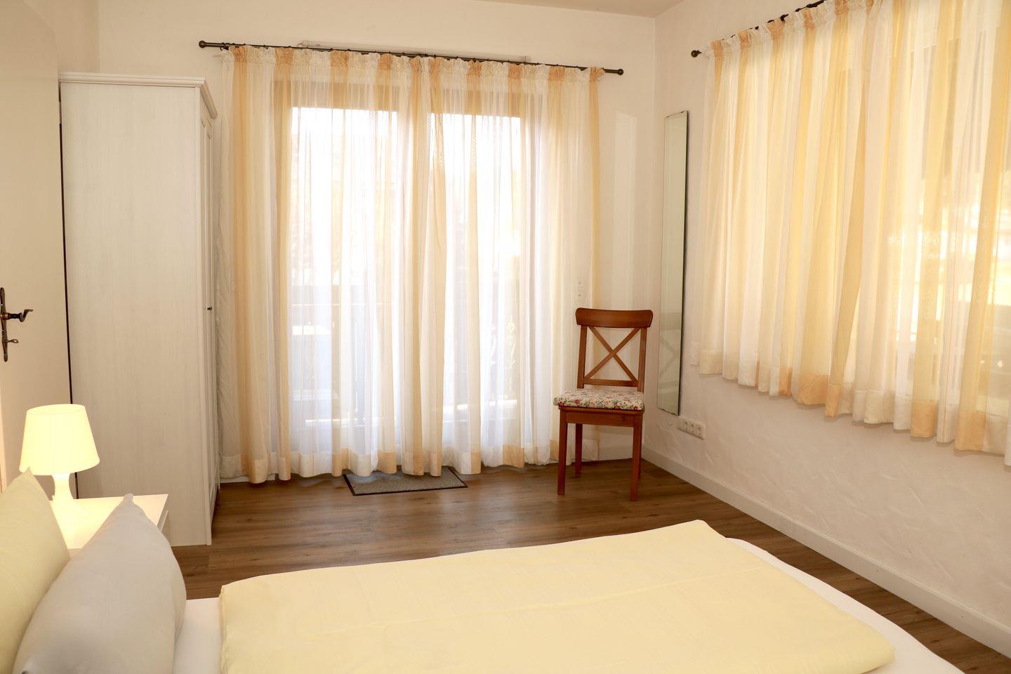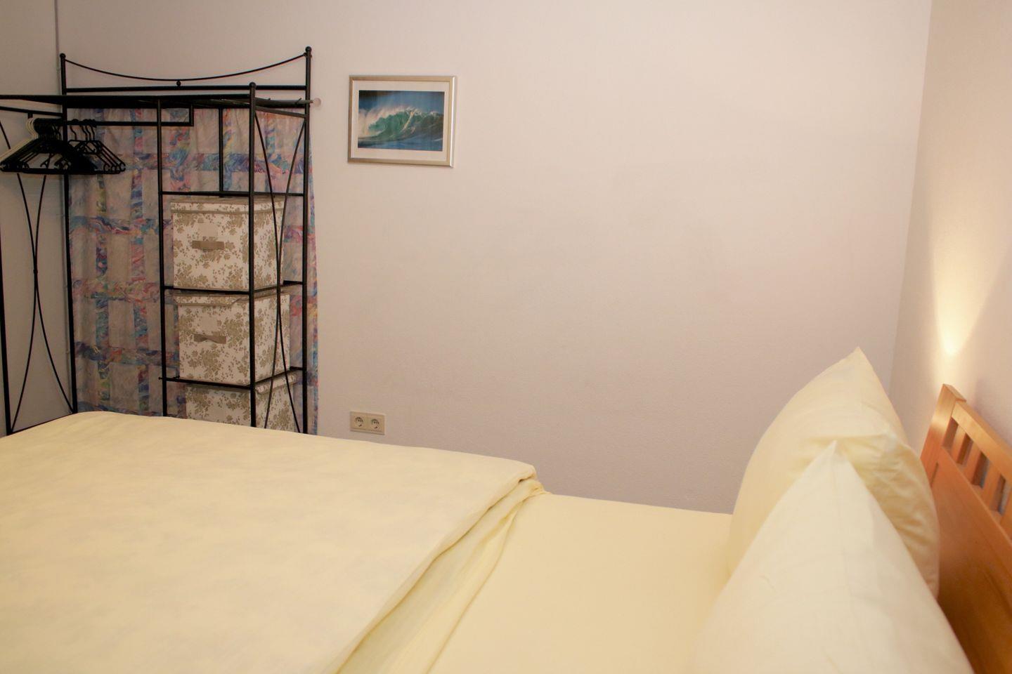 Das 1. Schlafzimmer findet sich ebenfalls hier, im Anschluss an das Wohnzimmer. Es wartet ein gemütliches Doppelbett für ausreichend Platz für 2 Personen auf Sie. Wie der Rest der Wohnung ist auch das Schlafzimmer mit ausreichend Fenstern ausgestattet.