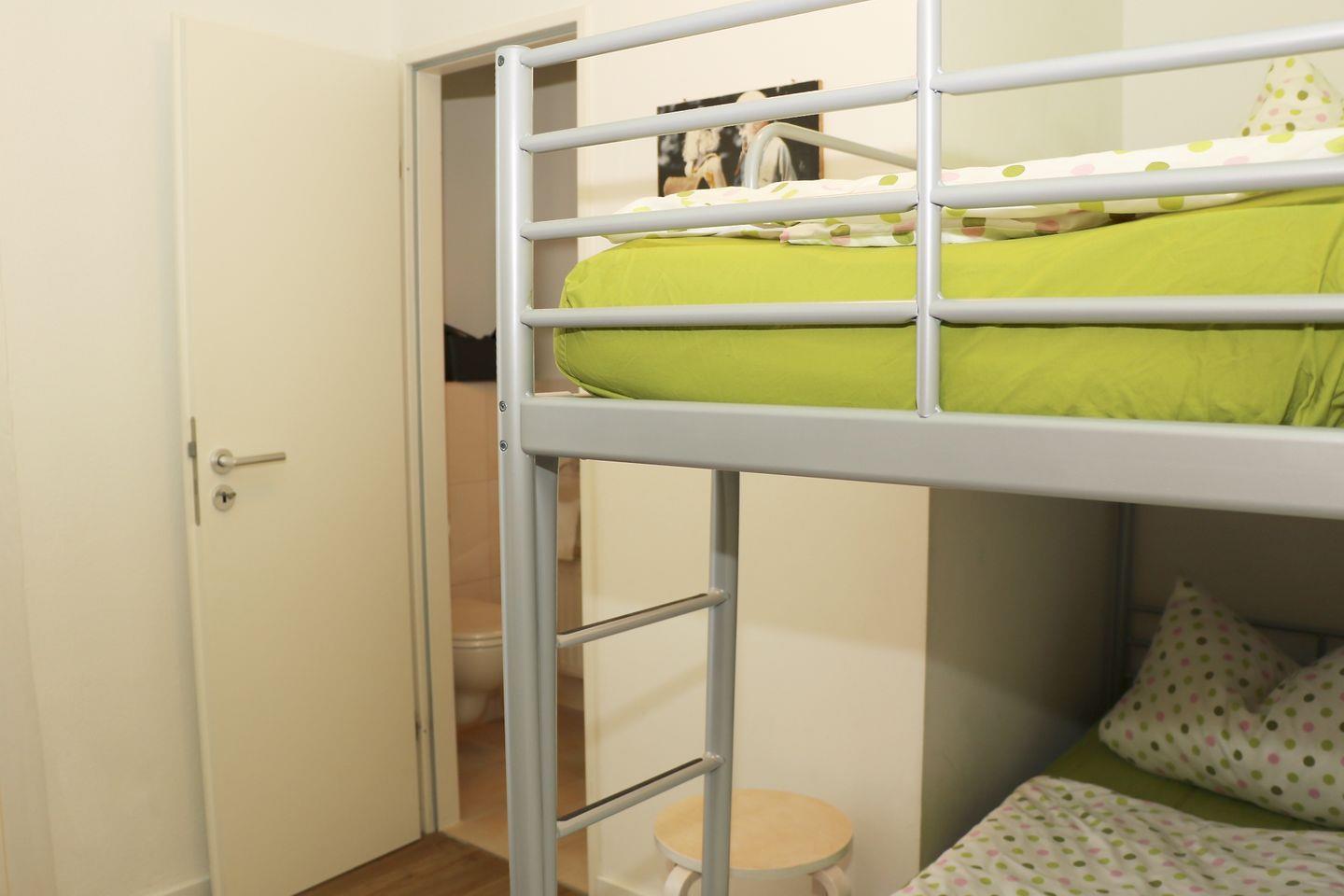 Durch einen schmalen Gang erreicht man auf der anderen Seite der Wohnung das Gäste-WC, ein weiteres Schlafzimmer mit 2 Einzelbetten, ein Badezimmer mit XXL-Dusche und zwei Waschbecken, ein 3. Schlafzimmer mit einem Stockbett sowie das 4. und letzte Schlafzimmer, ausgestattet mit einem regulären Doppelbett. Im Zimmer mit Stockbett befindet sich zudem ein weiteres kleines Badezimmer mit Dusche.