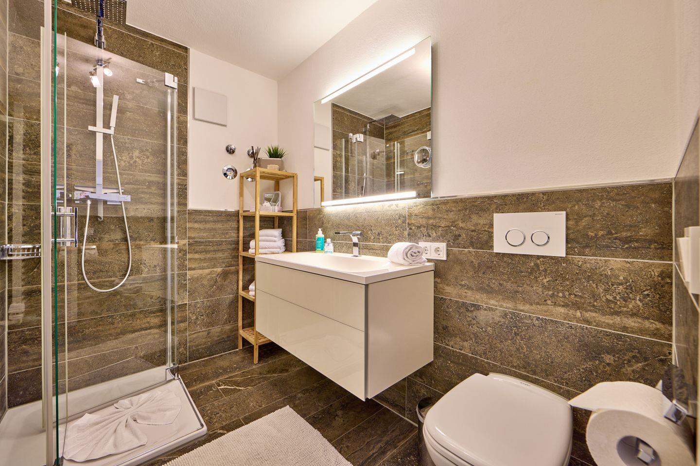 Das moderne Badezimmer bietet eine Wellness-Dusche, einen großen beleuchteten Spiegel und einen Handtuchtrockner.