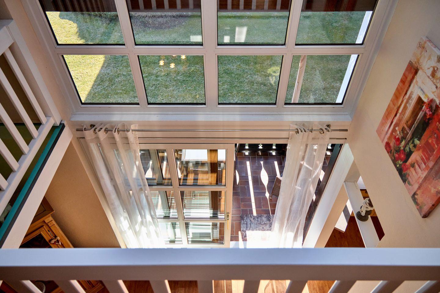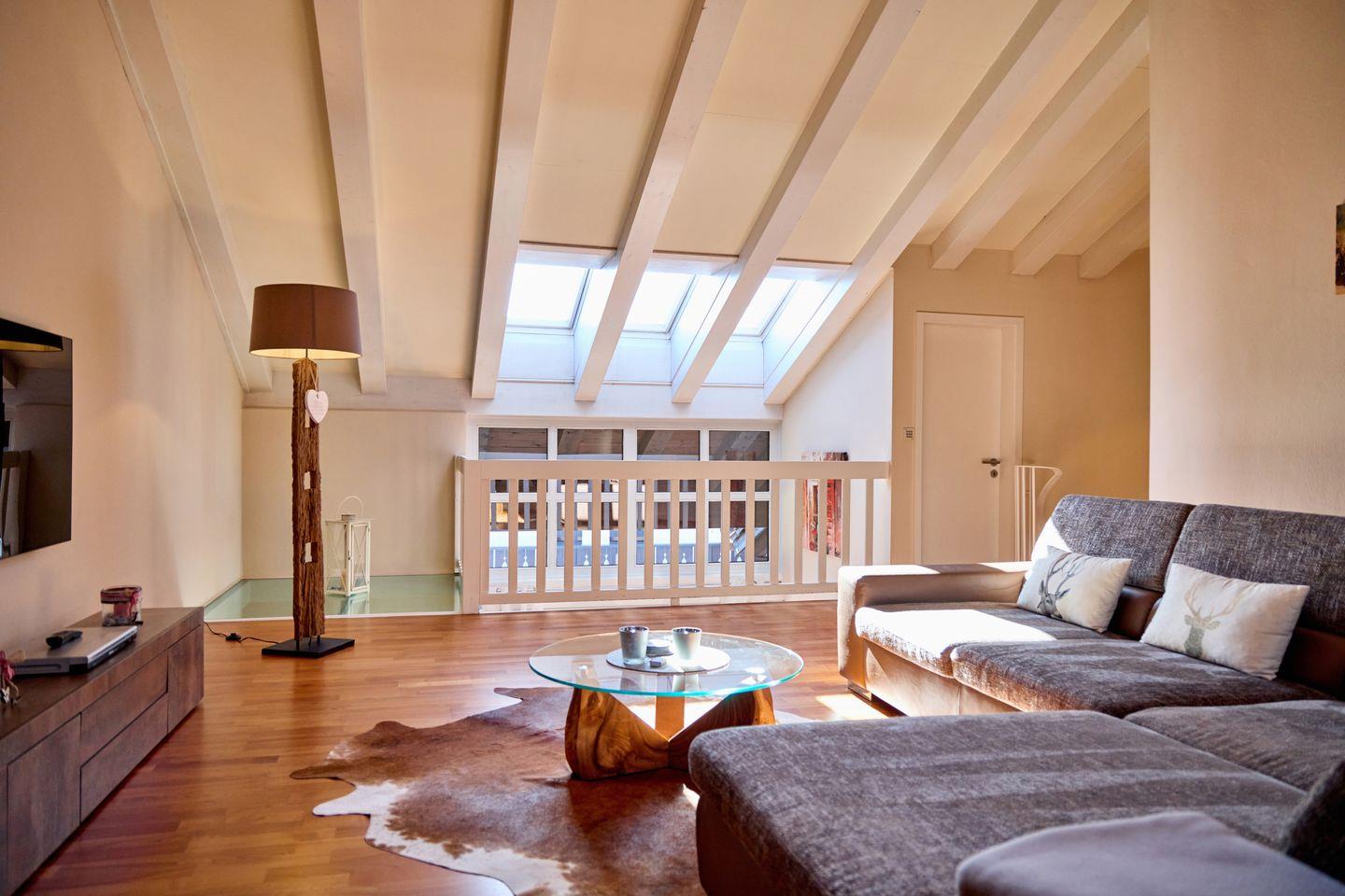 Den oberen Teil der Maisonette Wohnung erreichen Sie über die Wendeltreppe. Sie werden von einer eleganten und bequemen Wohnlandschaft erwartet. Hinsetzen, Füße hochlegen und den Lieblingsfilm auf dem großen, internetfähigen Smart-TV mit Soundbox genießen.
