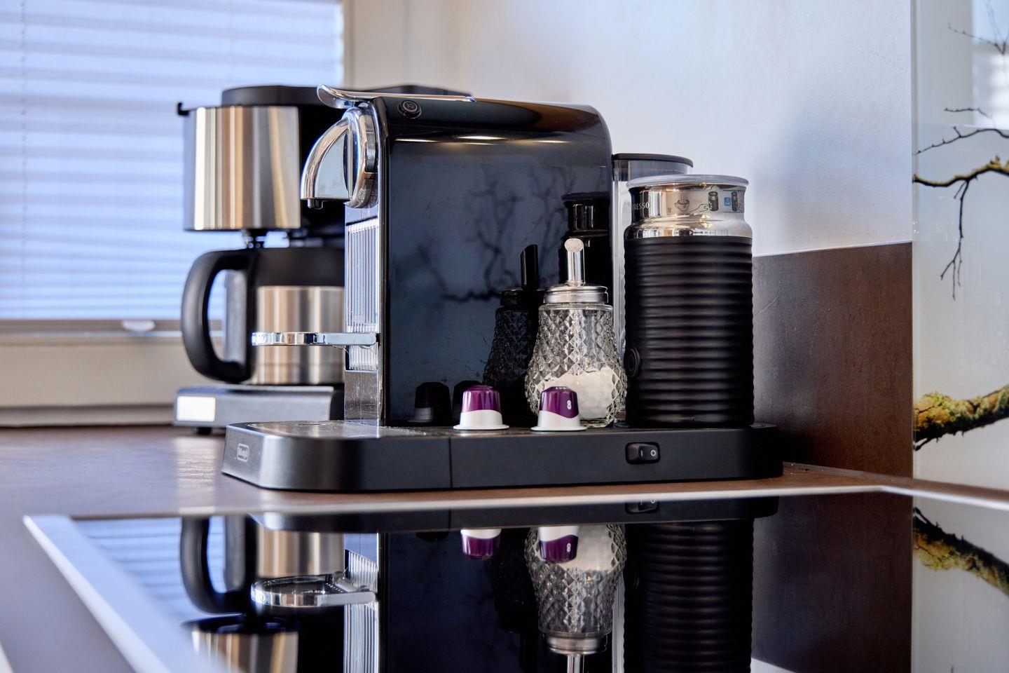 Die moderne, alpine Einbauküche ist ein Highlight. Viele beleuchtete Glaselemente sorgen für ein tolles Ambiente. Elektrogeräte - von der Spülmaschine bis zum Kühlschrank - sind da, die Küche ist voll ausgestattet. Für Kaffeeliebhaber steht sowohl eine Filterkaffeemaschine als auch eine Nespresso-Maschine zum Einsatz bereit.