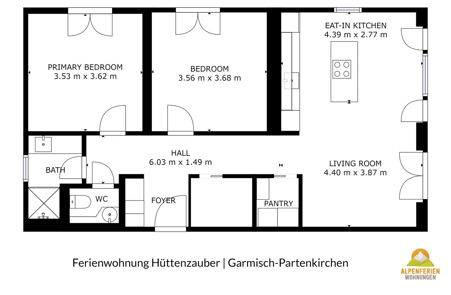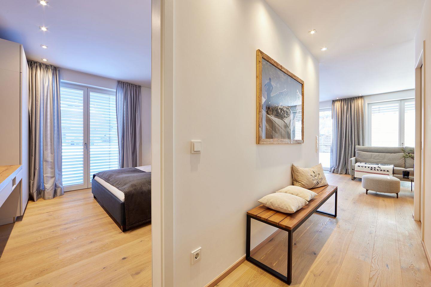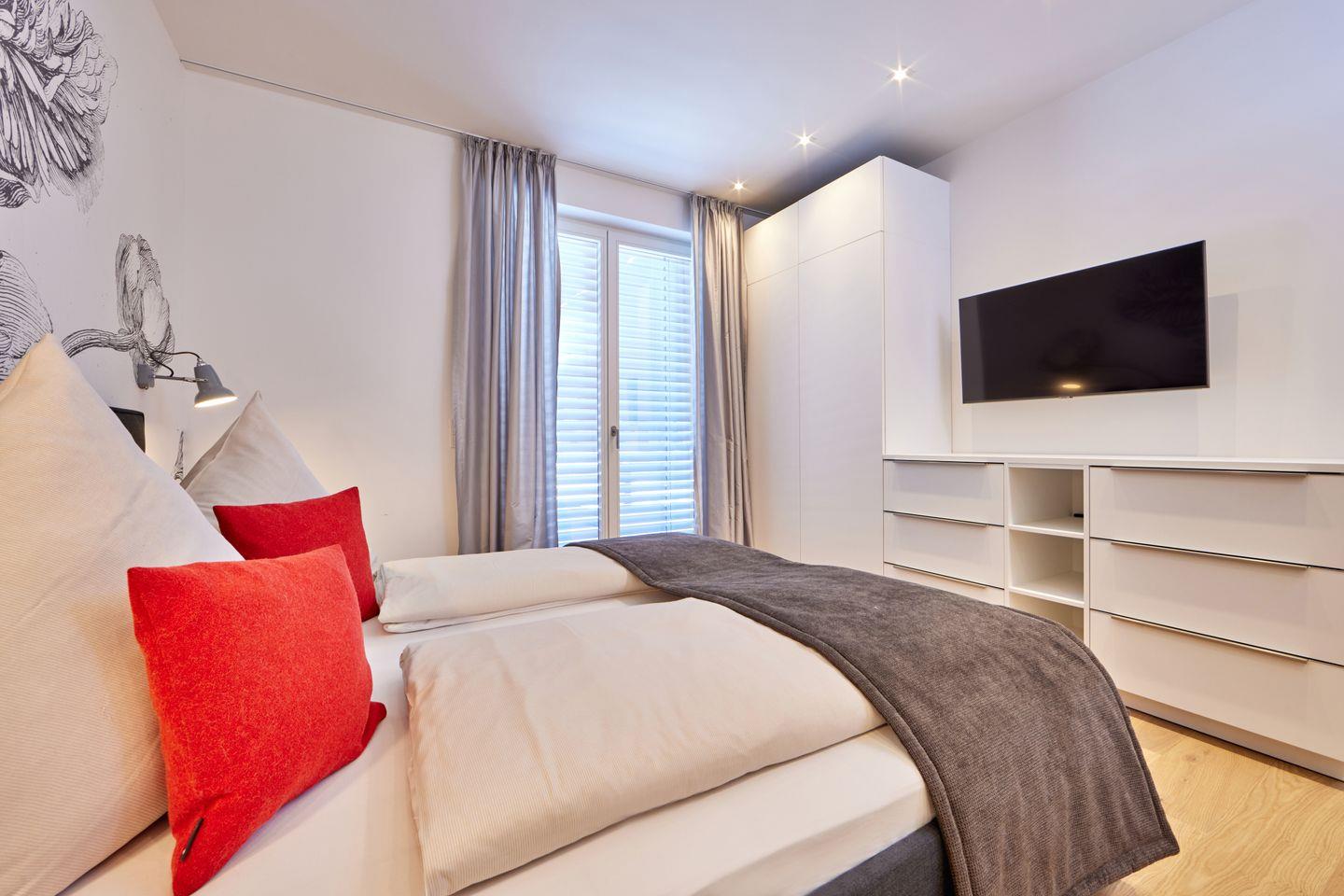 Abgerundet wird die Wohnung durch 2 bequeme Schlafzimmer mit Doppelbetten, einem hellen Badezimmer mit Regendusche und einem separaten Gäste-WC.
