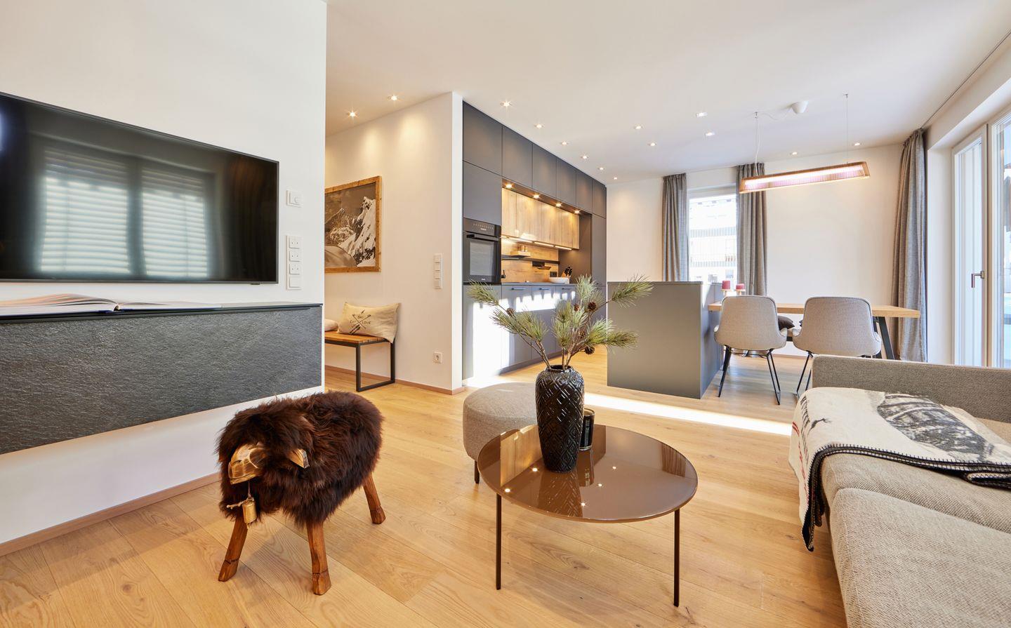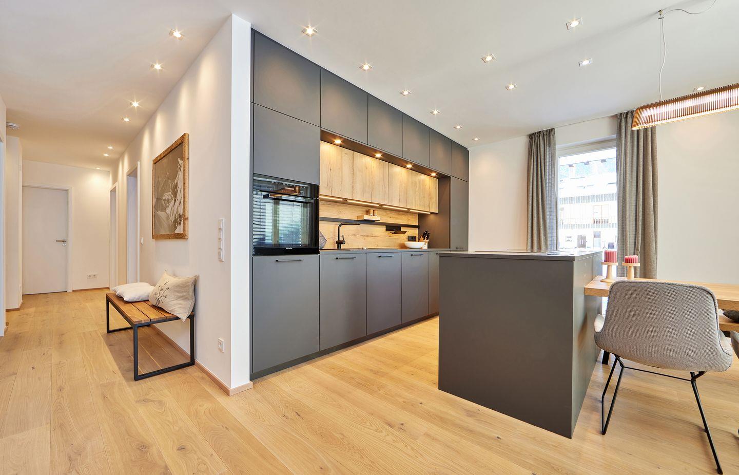 Ein geräumiger Wohnraum mit offener und hochwertig ausgestatteter Küche und gemütlichem Essplatz bildet das Herzstück der Wohnung.