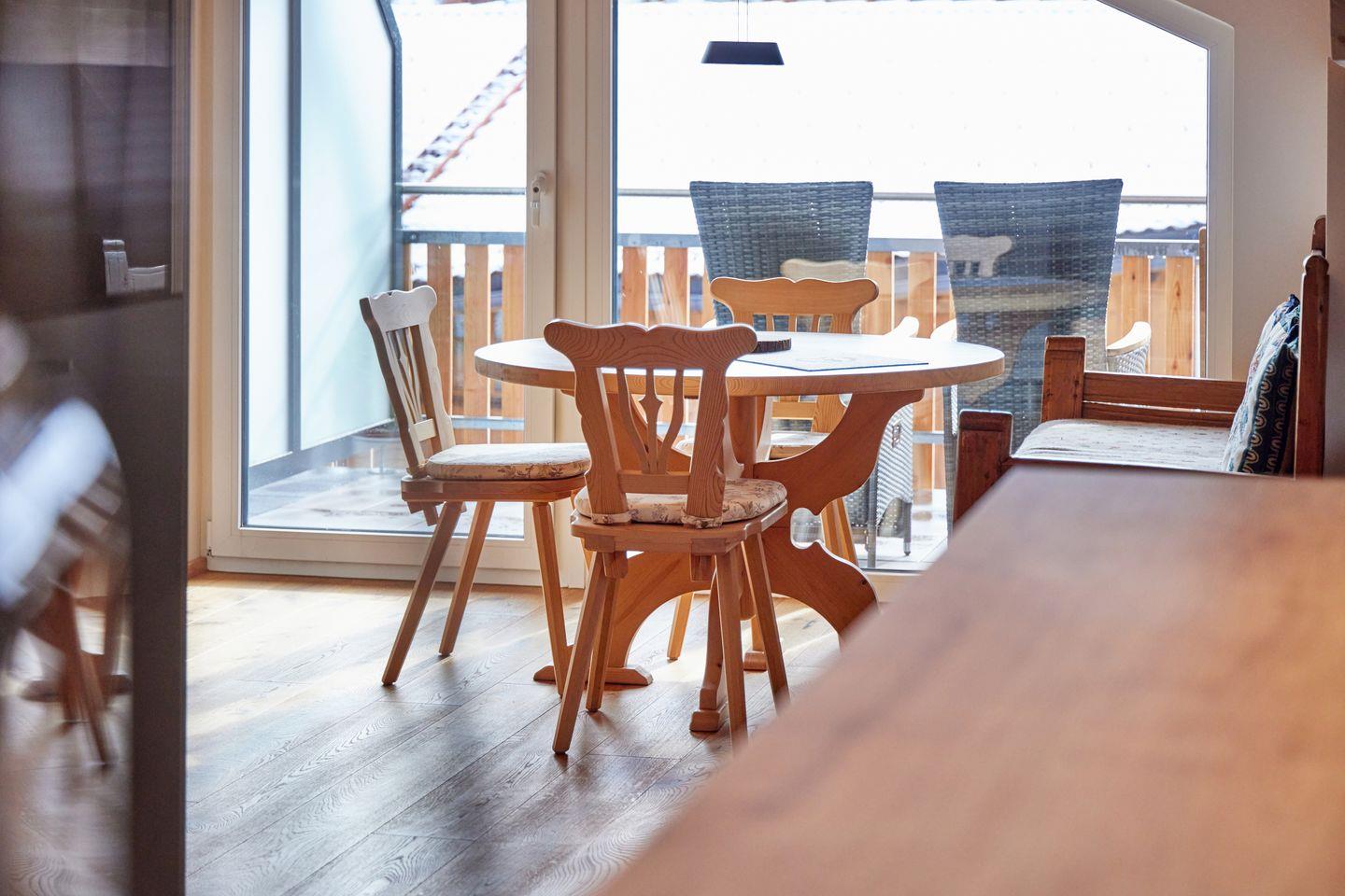 Vom Wohnraum aus haben Sie Zugang zu zwei großzügigen Balkonen mit Balkonmöbeln und Lounge-Ecke. Hier können Sie von der ersten bis zur letzten Sonnenstunde frische Luft tanken und das herrliche Bergpanorama genießen.