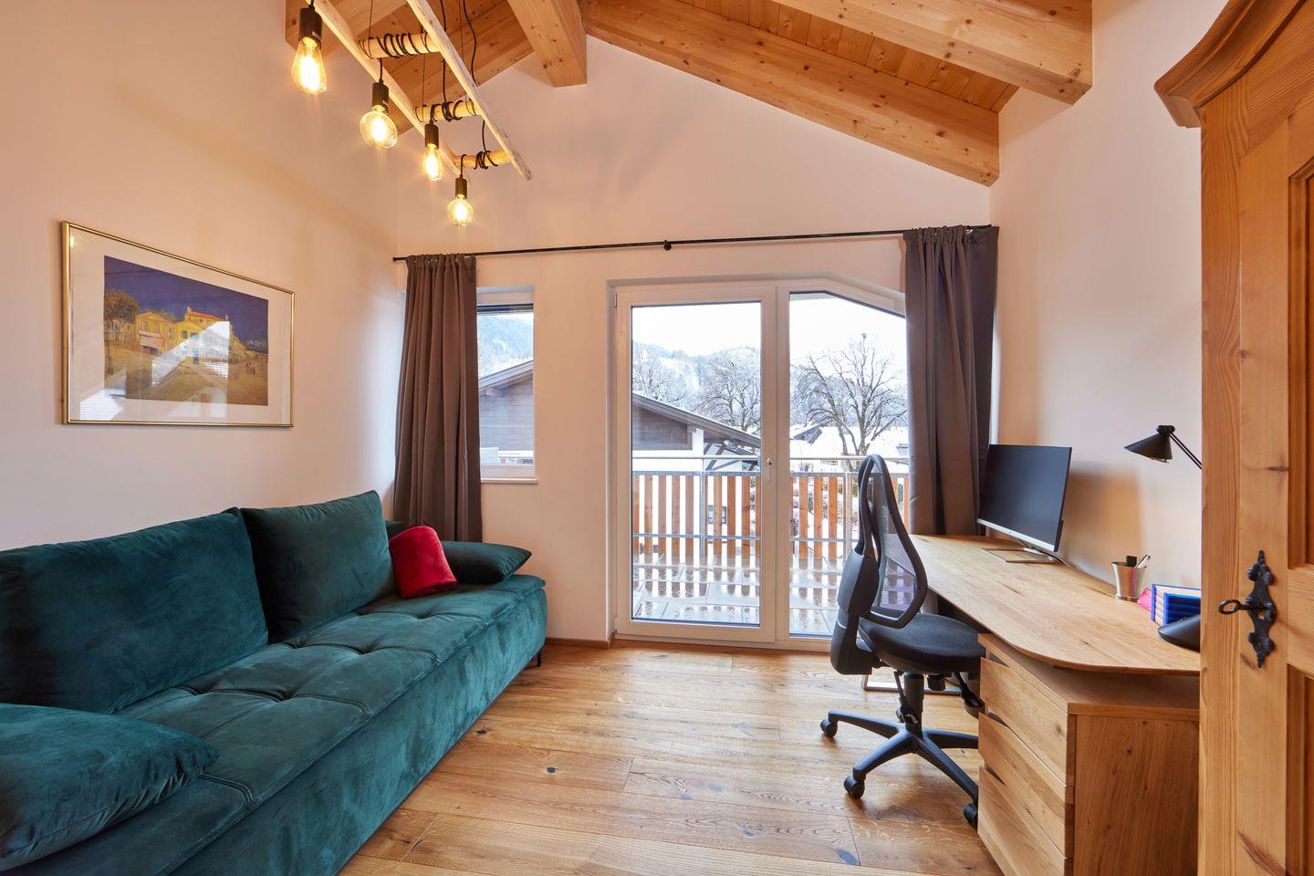 Ein weiteres Zimmer ist mit einer bequemen Couch ausgestattet, die sich auf 160 cm ausziehen und zu einer Schlafgelegenheit für einen weiteren Erwachsenen oder zwei Kinder umfunktionieren lässt. Hier finden Sie außerdem einen großen Schreibtisch mit Monitor, an dem Problemlos ein Laptop angeschlossen werden kann. Ein idealer Rückzugsort, wenn Sie einmal im Homeoffice ungestört arbeiten müssen.