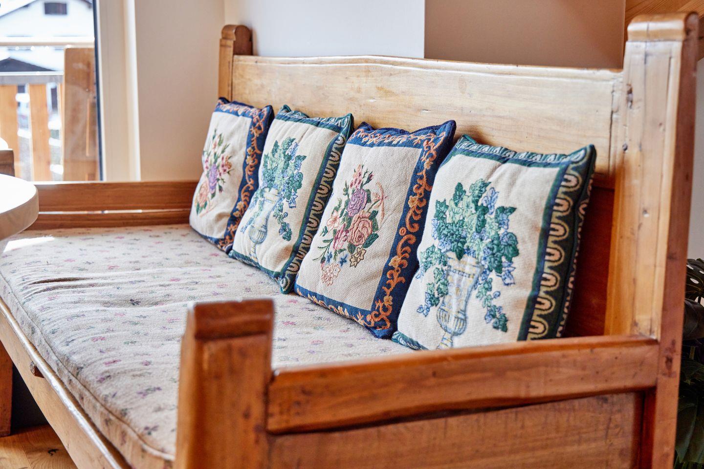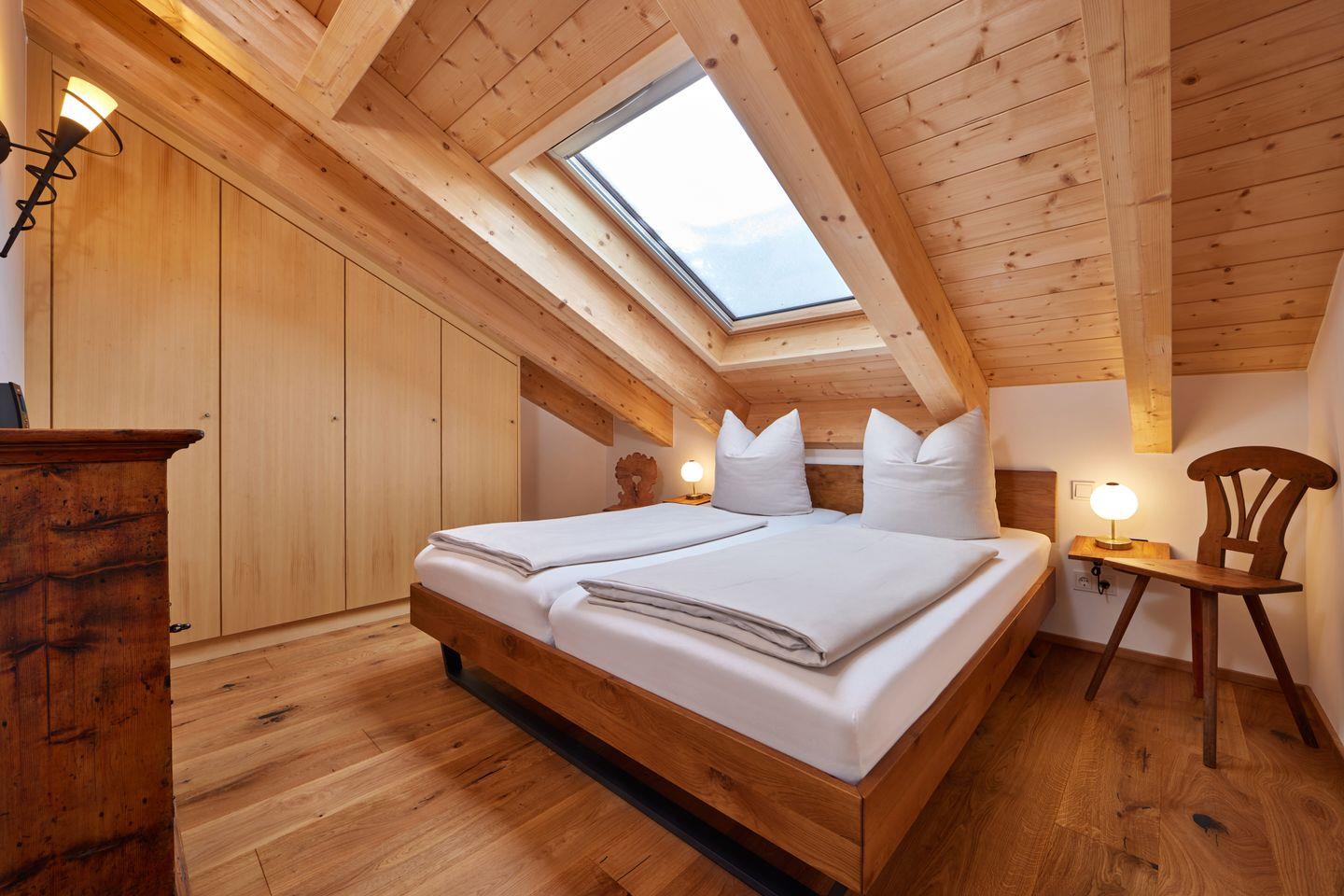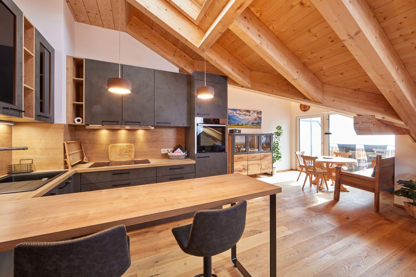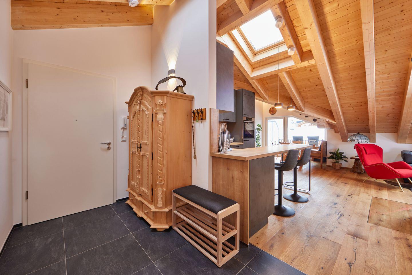 Genießen Sie Ihren Aufenthalt in diesem besonderen Apartment für Familien oder bis zu 4 Personen. Die hochwertige Einrichtung im modernen Design, gepaart mit ausgewählten antiken Möbelstücken, versprüht eleganten und alpinen Charme. Die geschickt platzierten Dachfenster lassen nicht nur viel Tageslicht in die Wohnung, sie ermöglichen auch großartige Ausblicke und holen die umliegende Bergwelt direkt in das Wohnzimmer.
