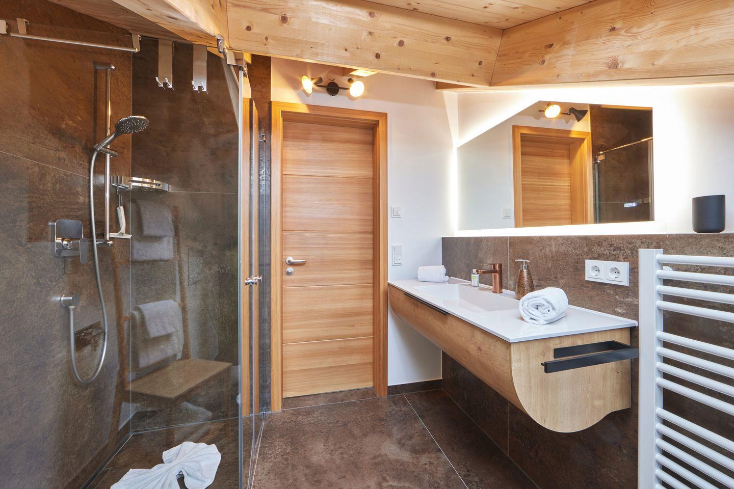 Ein modernes Bad mit großem Waschbecken, passendem Spiegel und einer ebenerdigen Dusche rundet die Ausstattung der Wohnung ab.