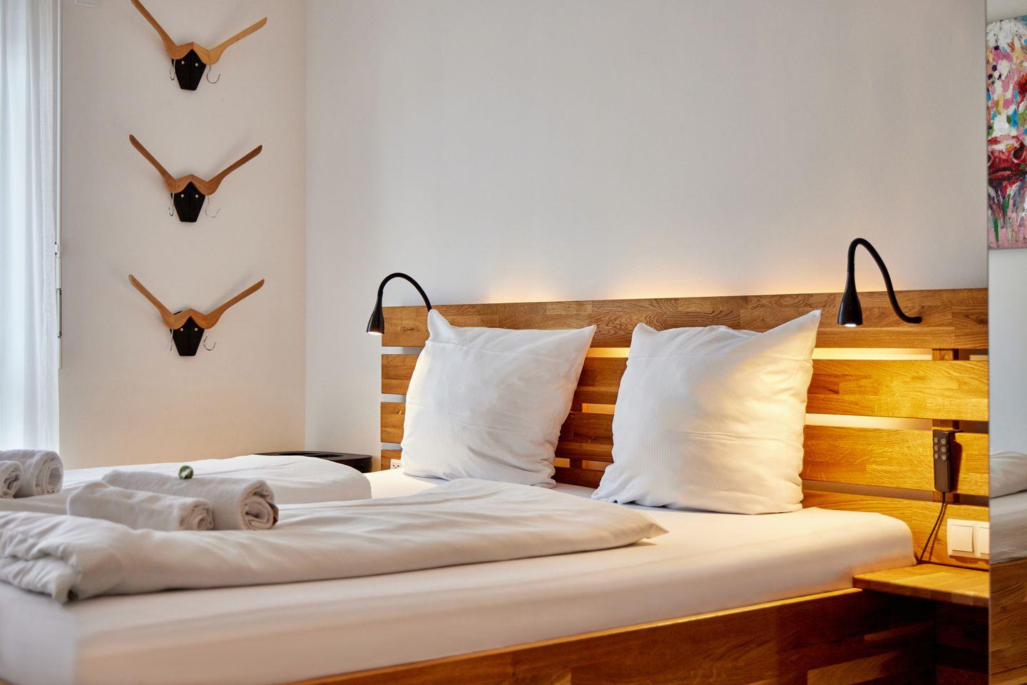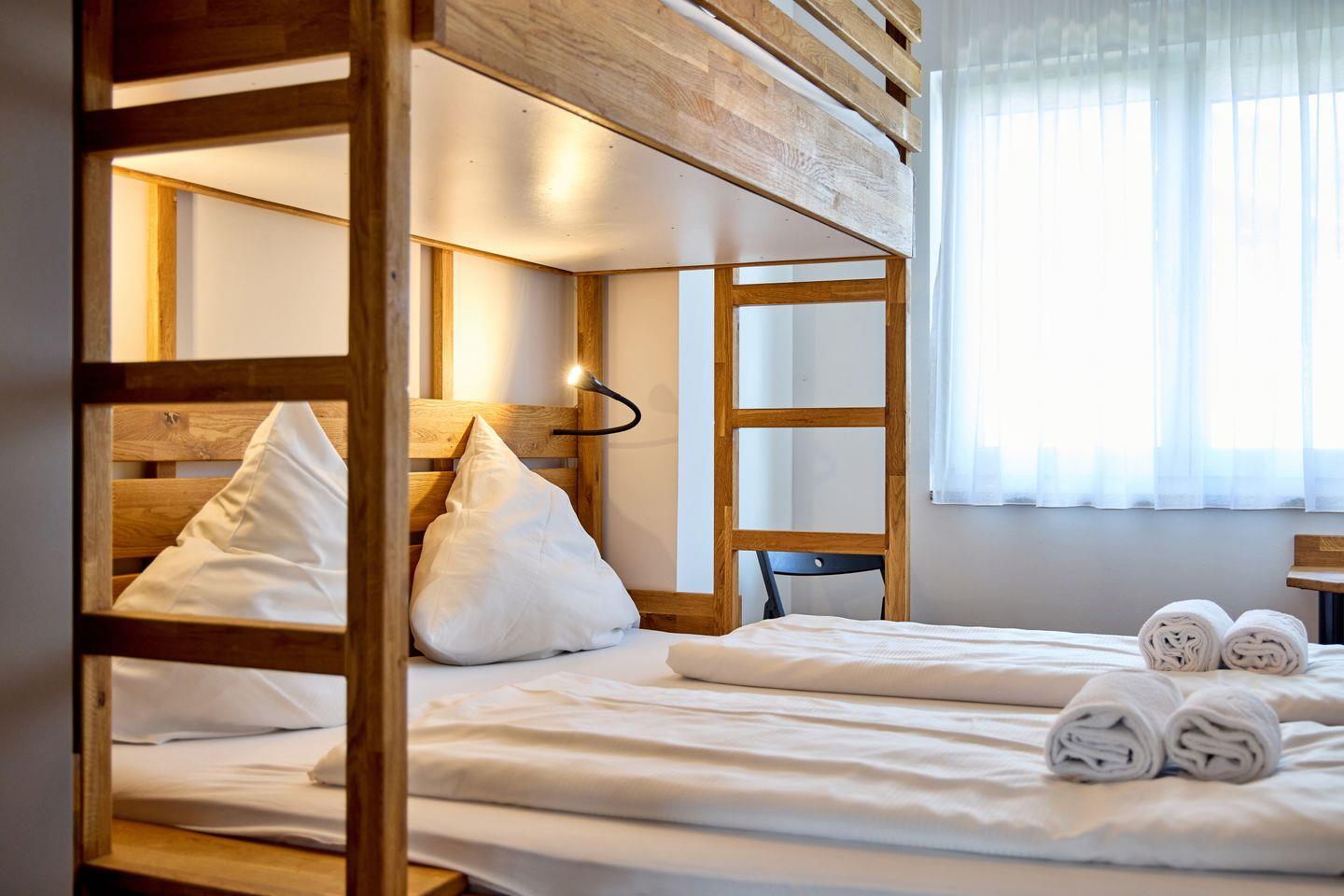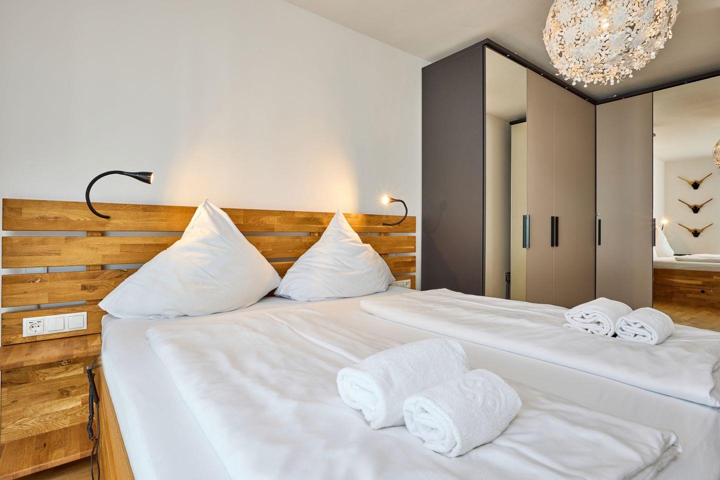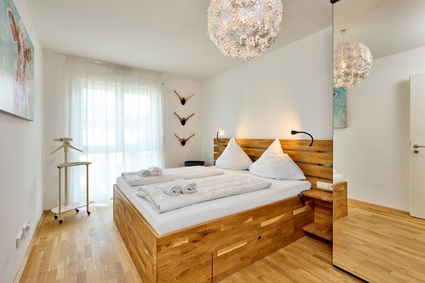 Das erste der beiden Schlafzimmer bietet ein bodentiefes Fenster, ein massives Eiche-Doppelbett mit elektrisch verstellbaren Lattenrosten, sowie einen geräumigen Schrank. Das zweite Schlafzimmer ist ebenfalls mit einem massiven Eiche-Doppelbett ausgestattet, weiters gibt es darüber gelegen ein vollwertiges sehr stabiles Einzelbett in gleicher Bauart als Stockbett. Ein Schrank, eine große Regalfläche sowie ein kleiner Schreibtisch runden die Ausstattung dieses Zimmers ab.