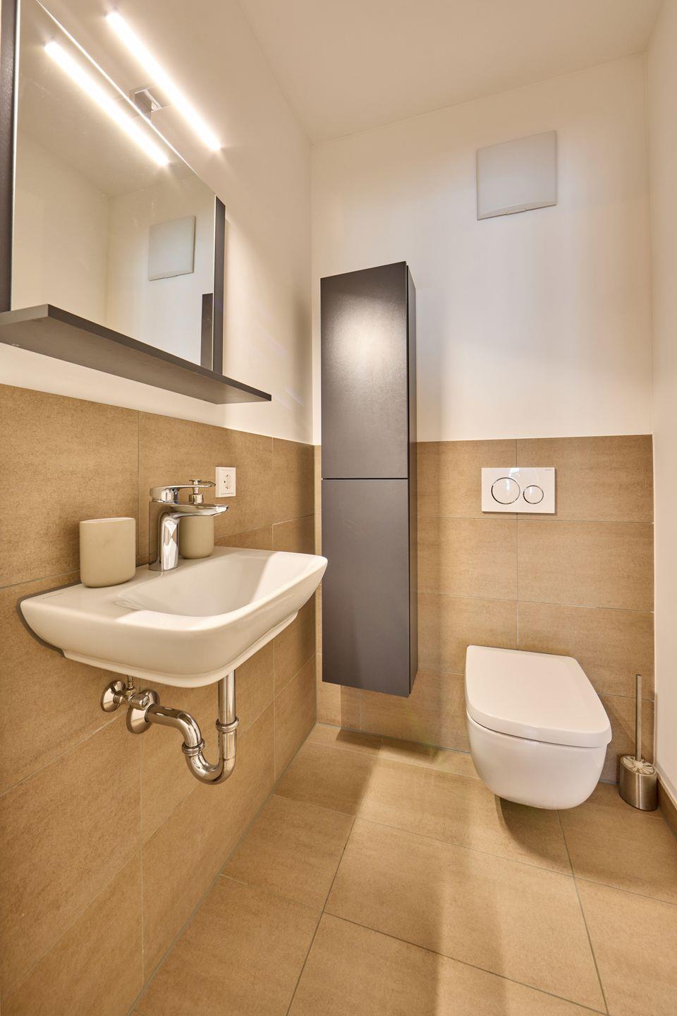 Das Gäste-WC bietet neben Toilette mit Waschbecken noch genügend Ablagefläche bzw. Stauraum.