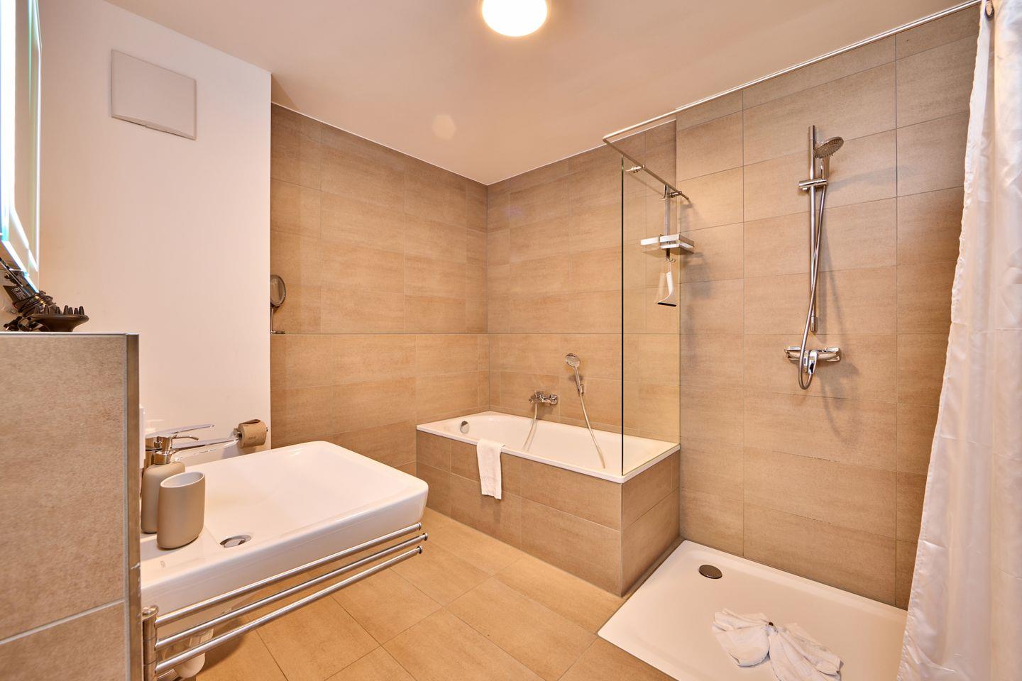 Das Badezimmer wartet mit einer bodenebenen, mit Rollstuhl überfahrbaren Dusche, einer Badewanne, einem unterfahrbaren Waschtisch, dem WC und einem elektrischen Handtuchheizkörper auf.