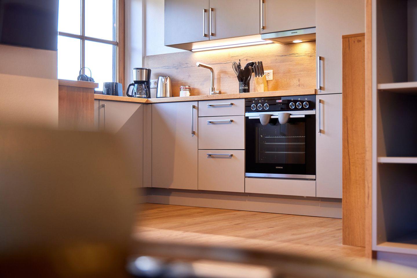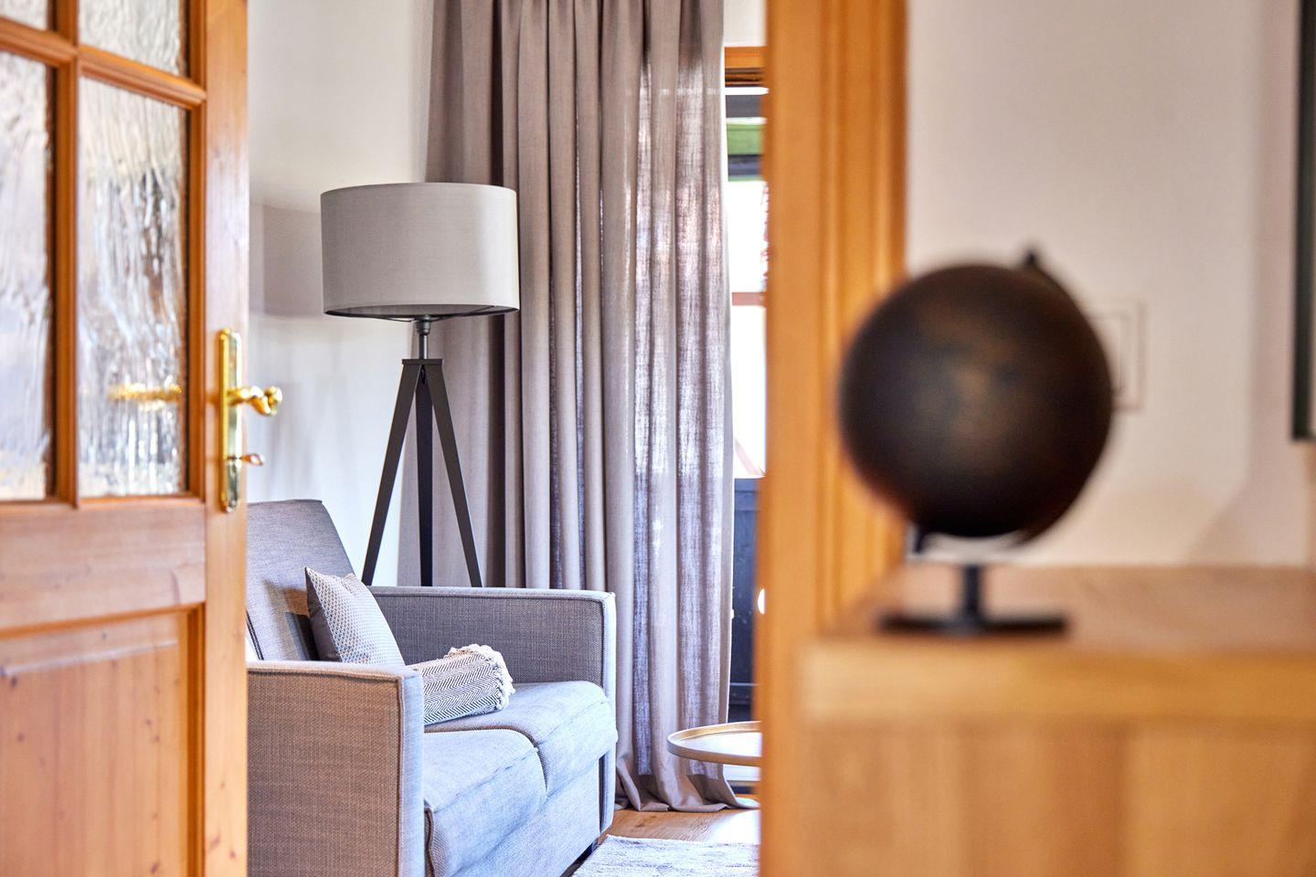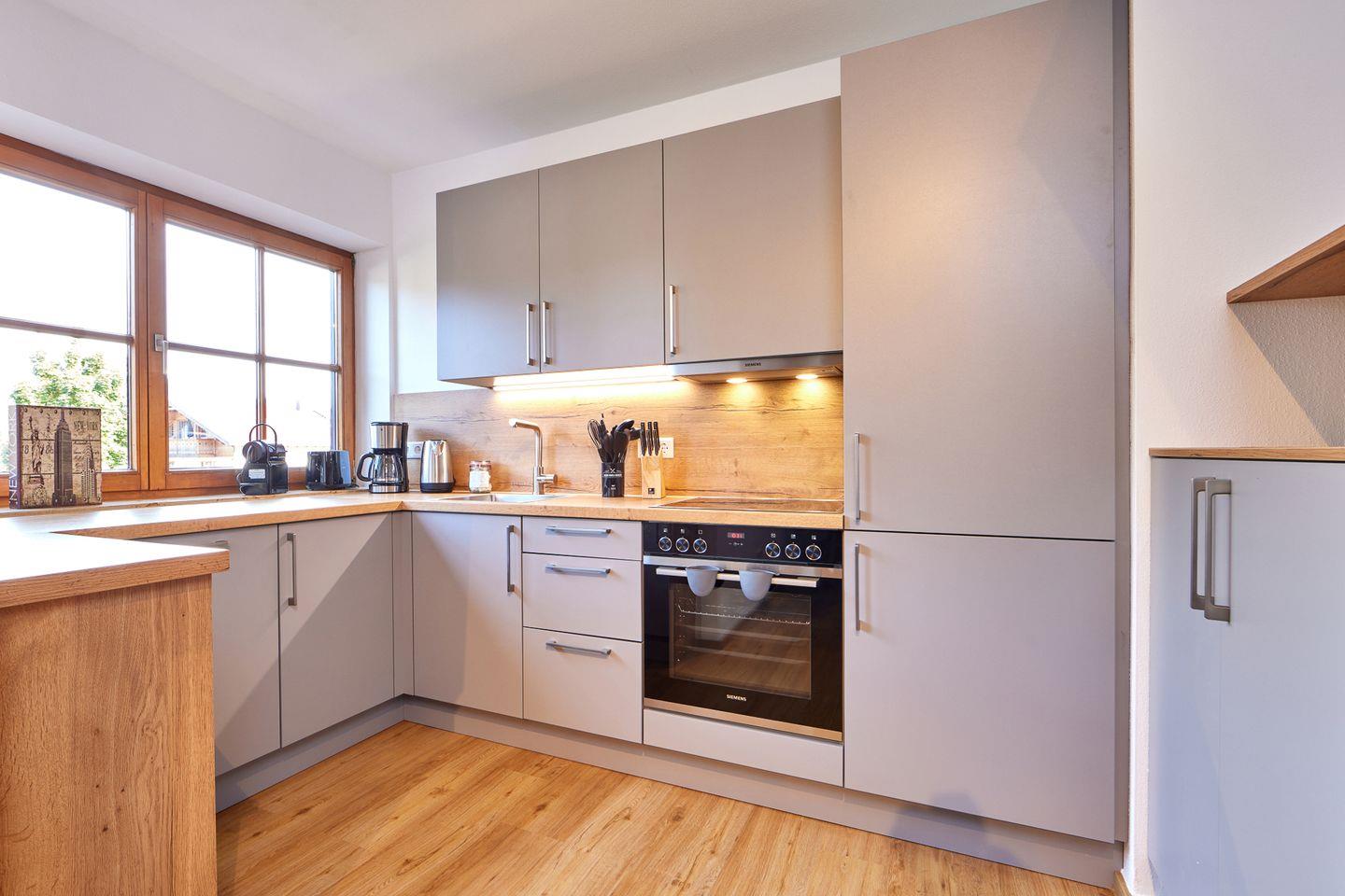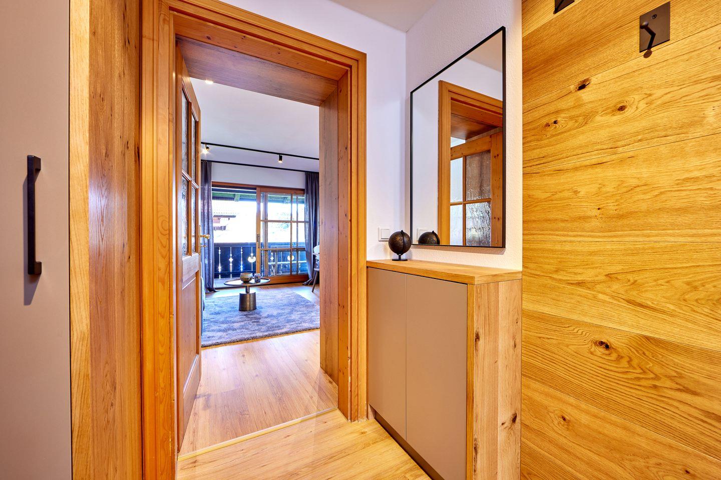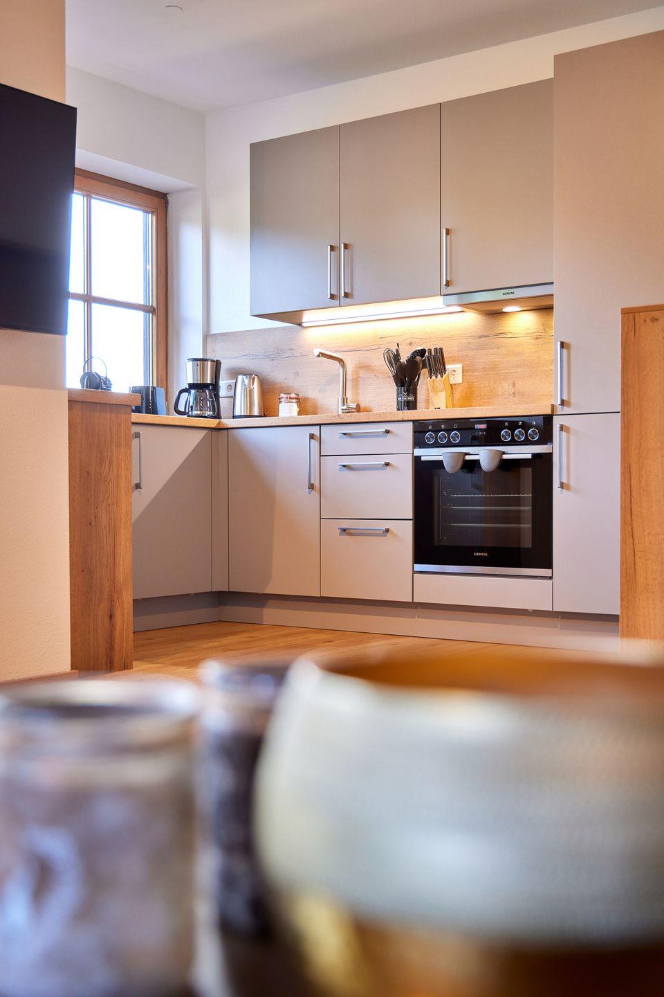 Der helle, offene Wohn- und Essbereich geht nahtlos in eine voll ausgestattete Küche mit hochwertigen Geräten und einer Nespresso-Cappuccino-Maschine über und schafft so einen eleganten und zugleich einladenden Raum, um sich nach einem Tag in den Bergen zu entspannen oder Gäste zu empfangen. Das Apartment verfügt über ein Schlafzimmer und ein hochwertiges Schlafsofa im Wohnbereich, auf dem bis zu vier Gäste bequem übernachten können.