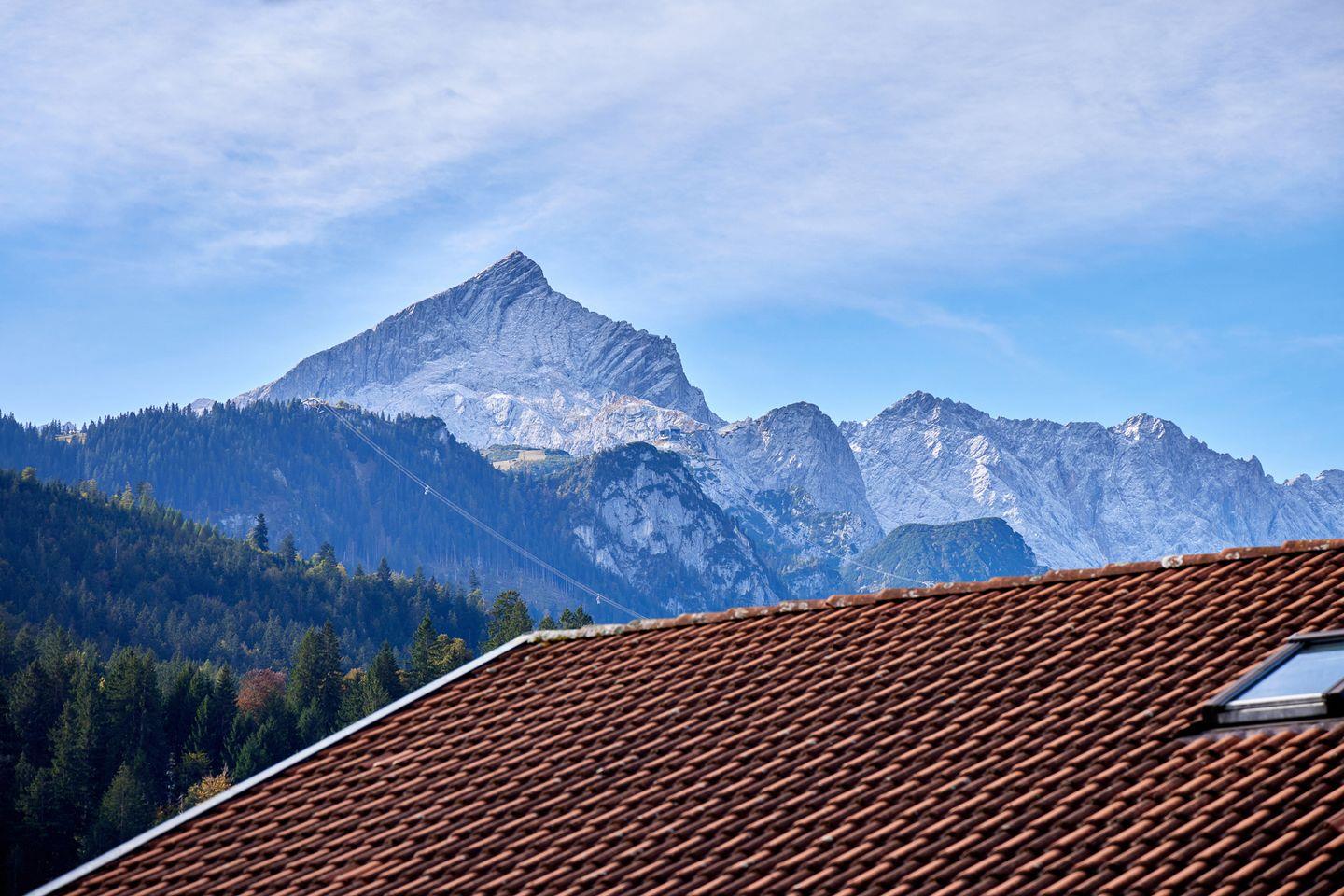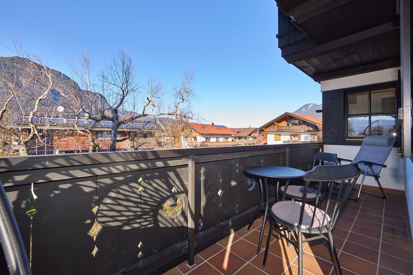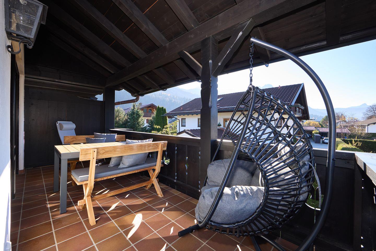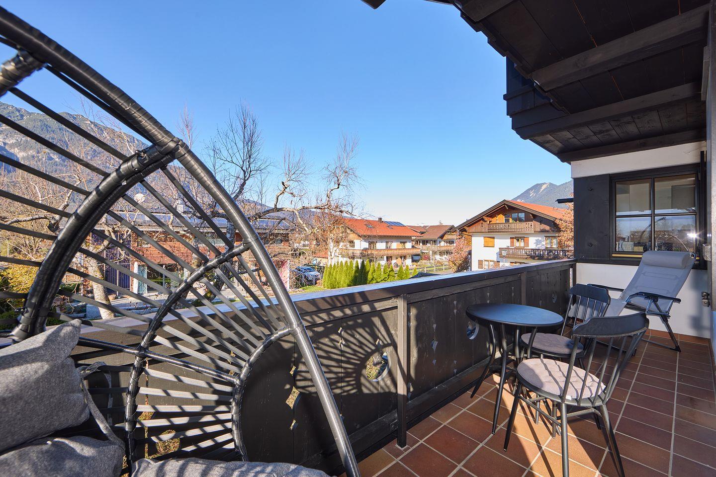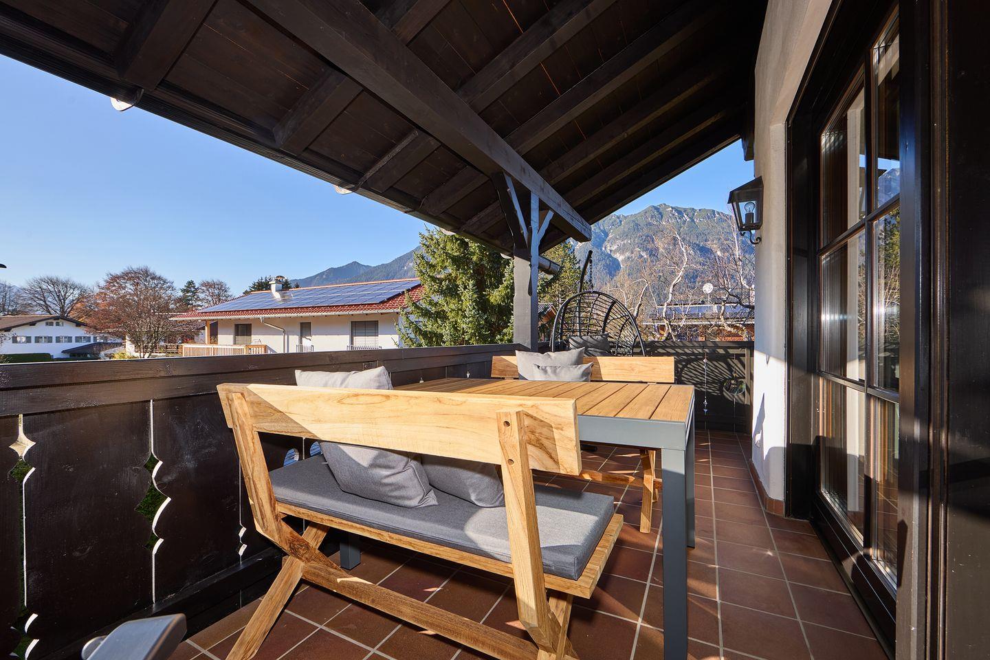 Ein besonderes Highlight ist der umlaufende Balkon mit direktem Blick auf die Alpspitze, der durchdacht mit einem Essbereich im Freien und einer Heizung ausgestattet ist – perfekt, um zu jeder Jahreszeit den Morgenkaffee oder entspannte Abende im Freien zu genießen.