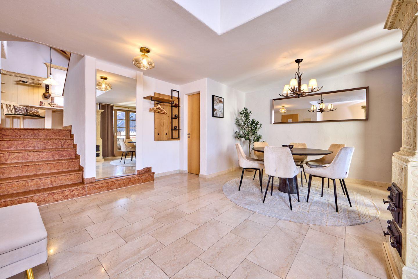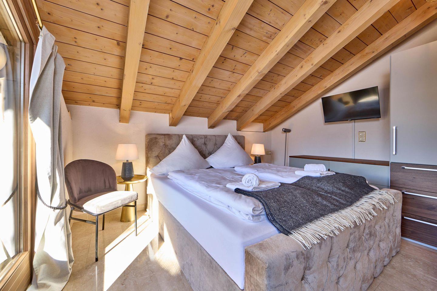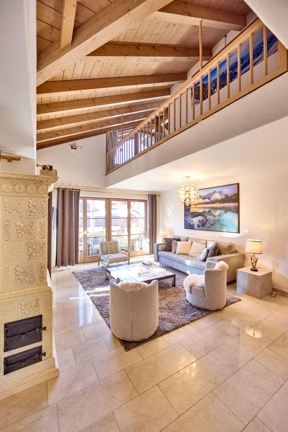 Der helle, offen gestaltete Wohn- und Essbereich ist mit hochwertigen Möbeln ausgestattet und verfügt über raumhohe Fenster, die eine elegante alpine Atmosphäre mit Panoramablick auf die Berge schaffen und direkten Zugang zu zwei Balkonen im unteren Bereich bieten. Ein dritter Balkon befindet sich auf der oberen Ebene, der an eines der Schlafzimmer angeschlossen ist und eine noch spektakulärere Aussicht bietet.