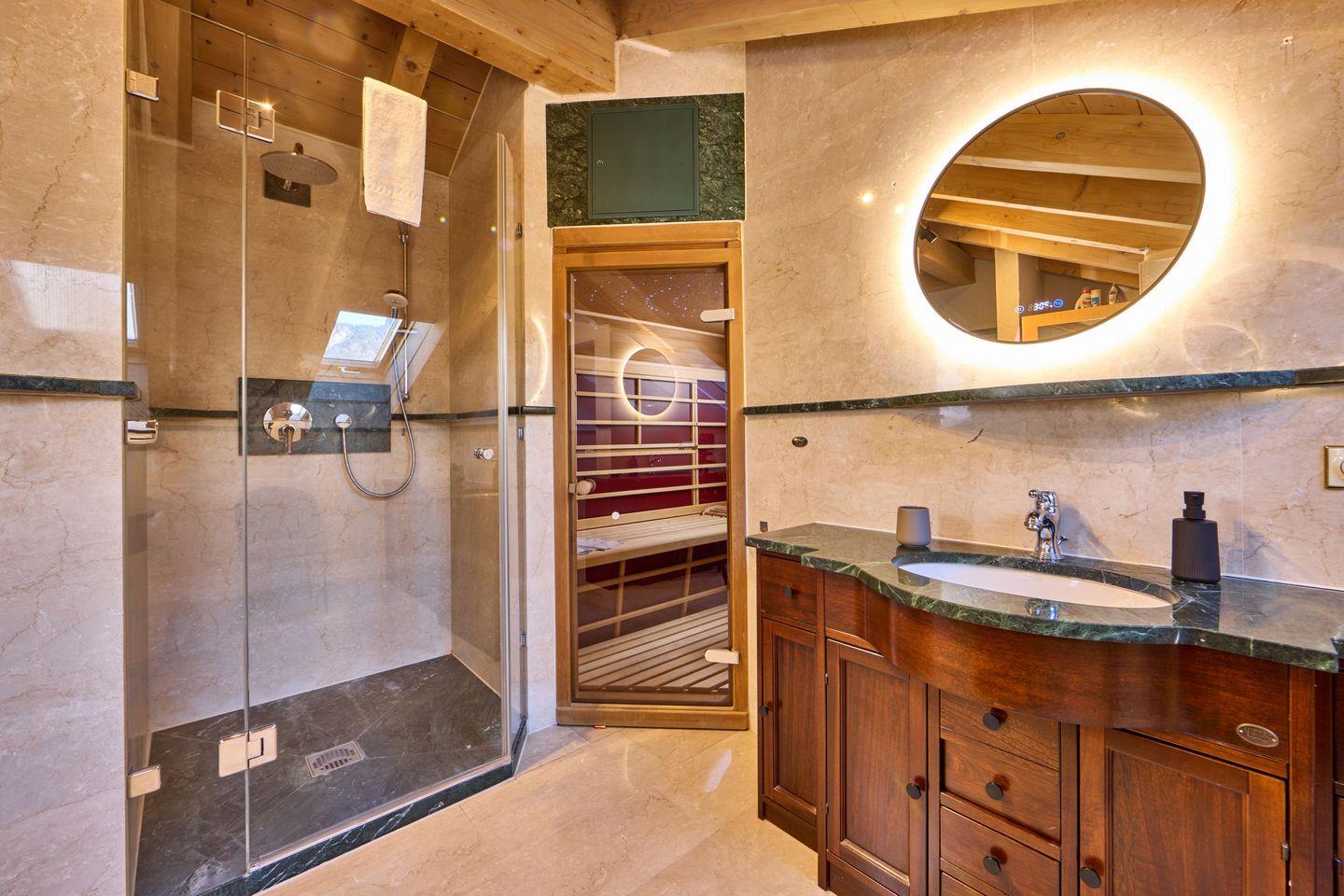 Das Apartment wurde sowohl auf Komfort als auch auf Stil ausgelegt und verfügt über eine private Infrarotsauna sowie drei Balkone – perfekt zum Entspannen nach einem Tag in den Bergen.