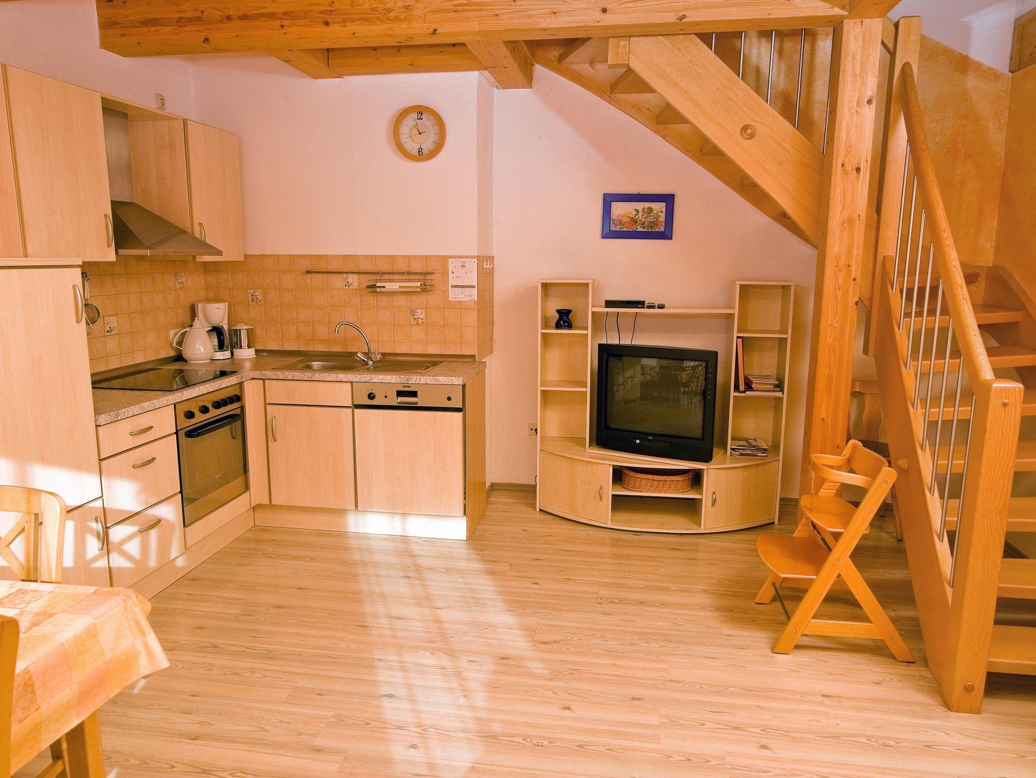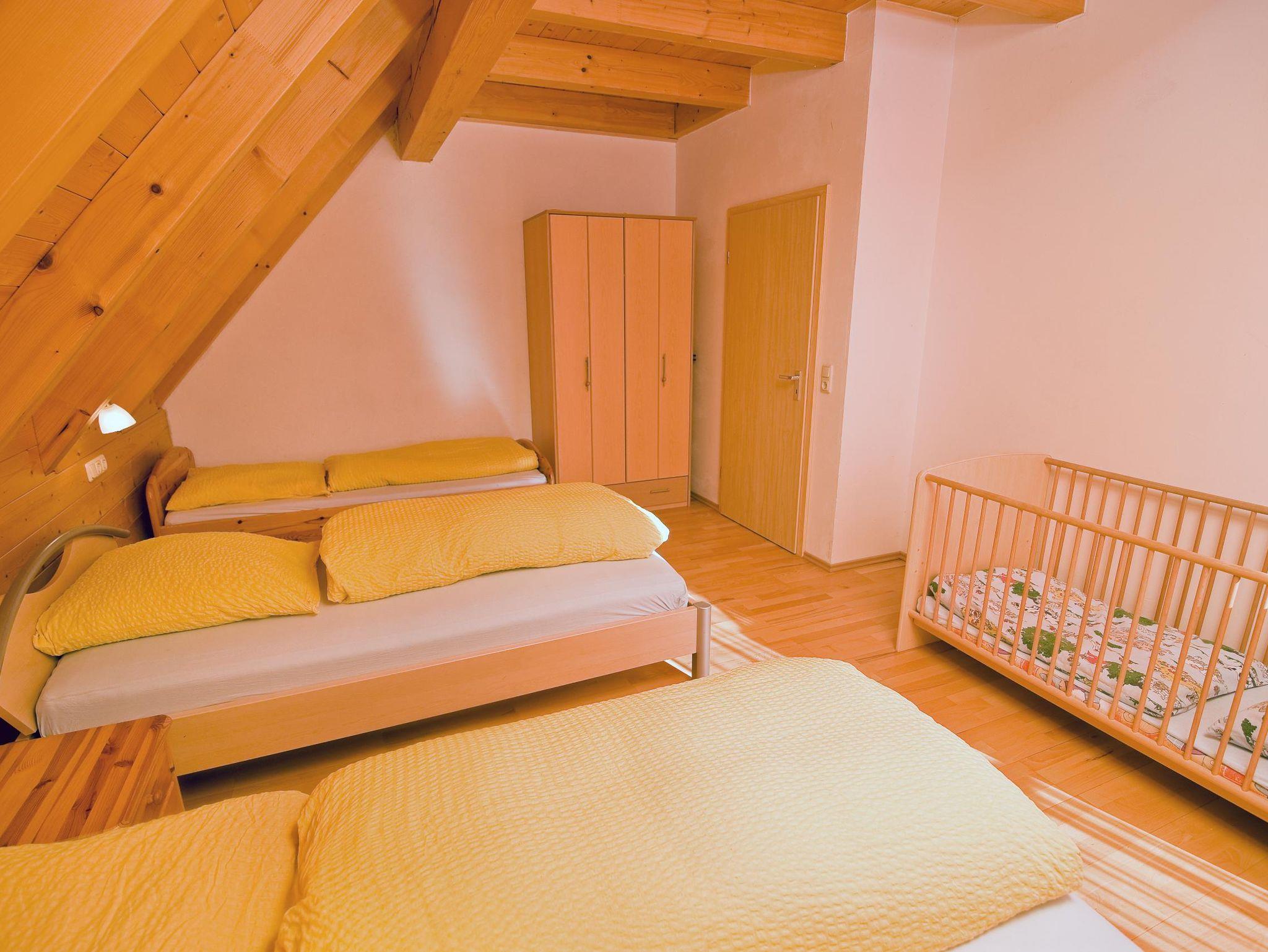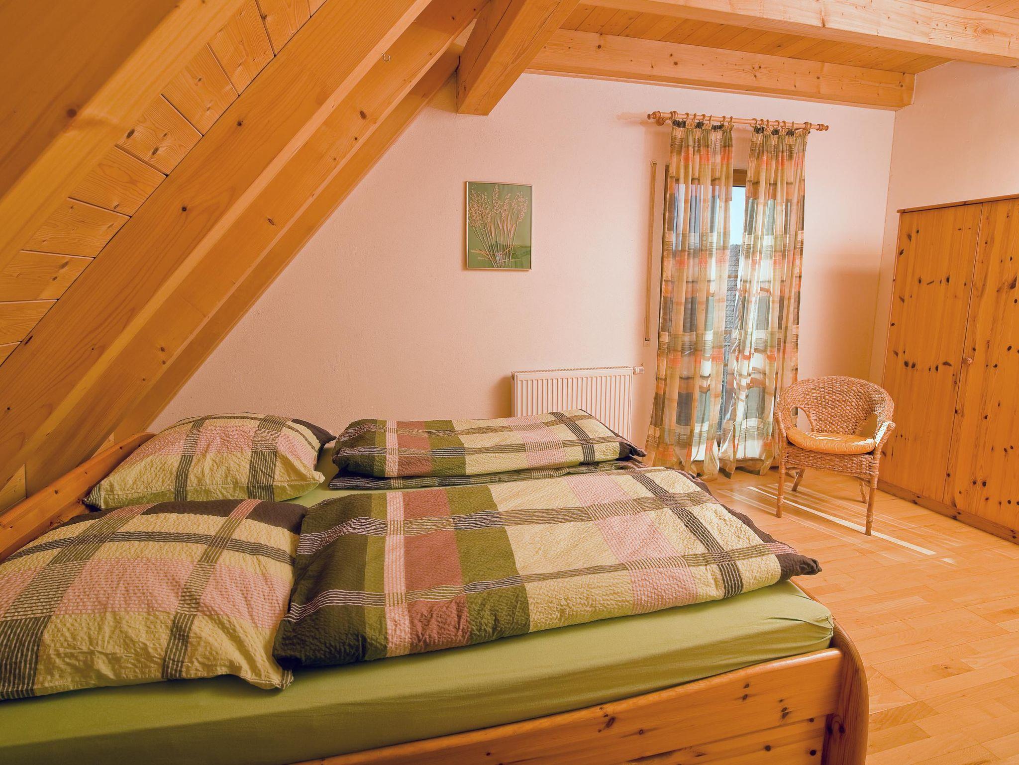 Die großzügige Ferienwohnung Gartenblick bietet auf ca. 80 m² viel Platz für Familien oder kleine Gruppen. Ein gemütlicher Wohnraum mit integrierter Küche bildet das Herzstück der Wohnung. Zwei separate Schlafräume im Dachgeschoss, jeweils mit Fliegengittern ausgestattet, sorgen für erholsamen Schlaf. Ein Schlafzimmer verfügt über ein Doppelbett. Das zweite Schlafzimmer bietet 3 Einzelbetten und ein Kindergitterbett. Die Küche verfügt über Herd, Spülmaschine, Kühlschrank, Kaffeemaschine, Wasserkocher und Toaster. Ein Kinderhochstuhl ist vorhanden. Das moderne Bad ist mit Dusche und WC ausgestattet. Besonders schön ist der große Südbalkon mit freiem Blick in die Natur. WLAN, Telefon und Satelliten-TV stehen kostenfrei zur Verfügung. Frühstück kann auf Wunsch hinzugebucht werden.