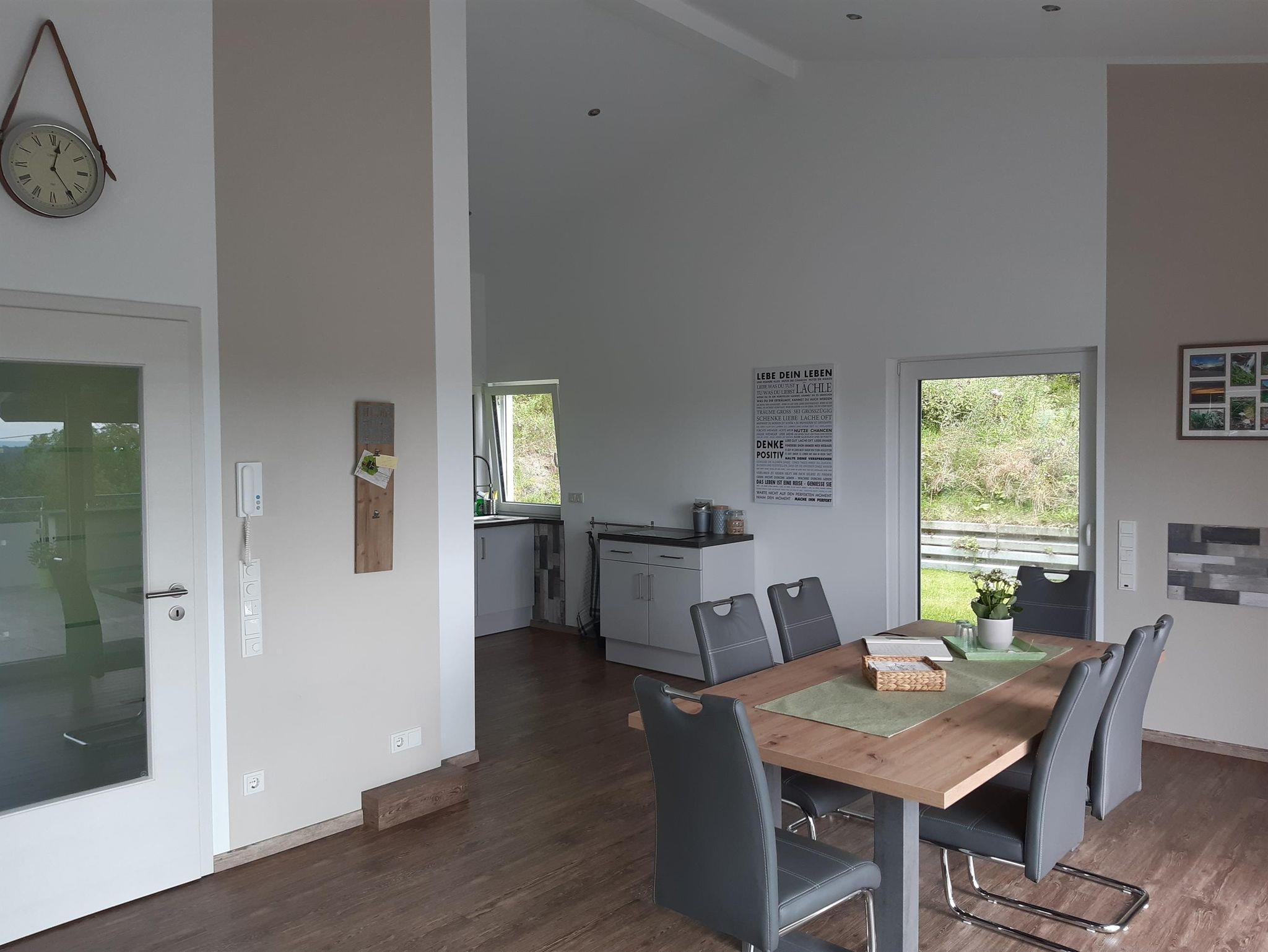 Die Bäder sind sehr weiträumig und die große Dusche ist frei begehbar. Die voll ausgestattete Küche ist offen und mit dem Wohnraum verbunden. Die Wohnräume sind aufgrund der großen Fenster lichtdurchflutet, es handelt sich um ein Niedrigenergie-Haus mit 3-fach Verglasung und Fußbodenheizung, das Panoramafenster im Wohnbereich hat eine 2 Meter breite Schiebetür, welche Zugang zur großen Terrasse ist.