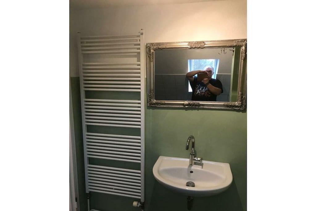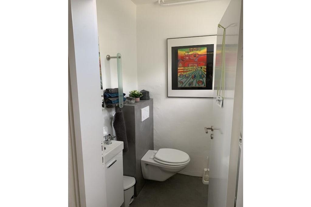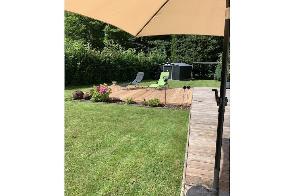 Ground floor: (hallway(Mirror, Wardrobe Coatrack), Living room(Armchair, library, TV), guest toilet(Mirror, toilet, washbasin), storage(Vacuum Cleaner, freezer, tumble dryer, washing machine, ironing board, iron, drying cabinet)) On the 1st floor: (bedroom(Bed Linen, double bed), bedroom(Bed Linen, Wardrobe, double bed), bathroom(toilet, bath tub, shower, washbasin, hairdryer)) Hot Water, First Aid, tumble dryer, washing machine, terrace(Sun Umbrella, garden furniture, sun loungers), parking, ironing board, iron, drying cabinet
