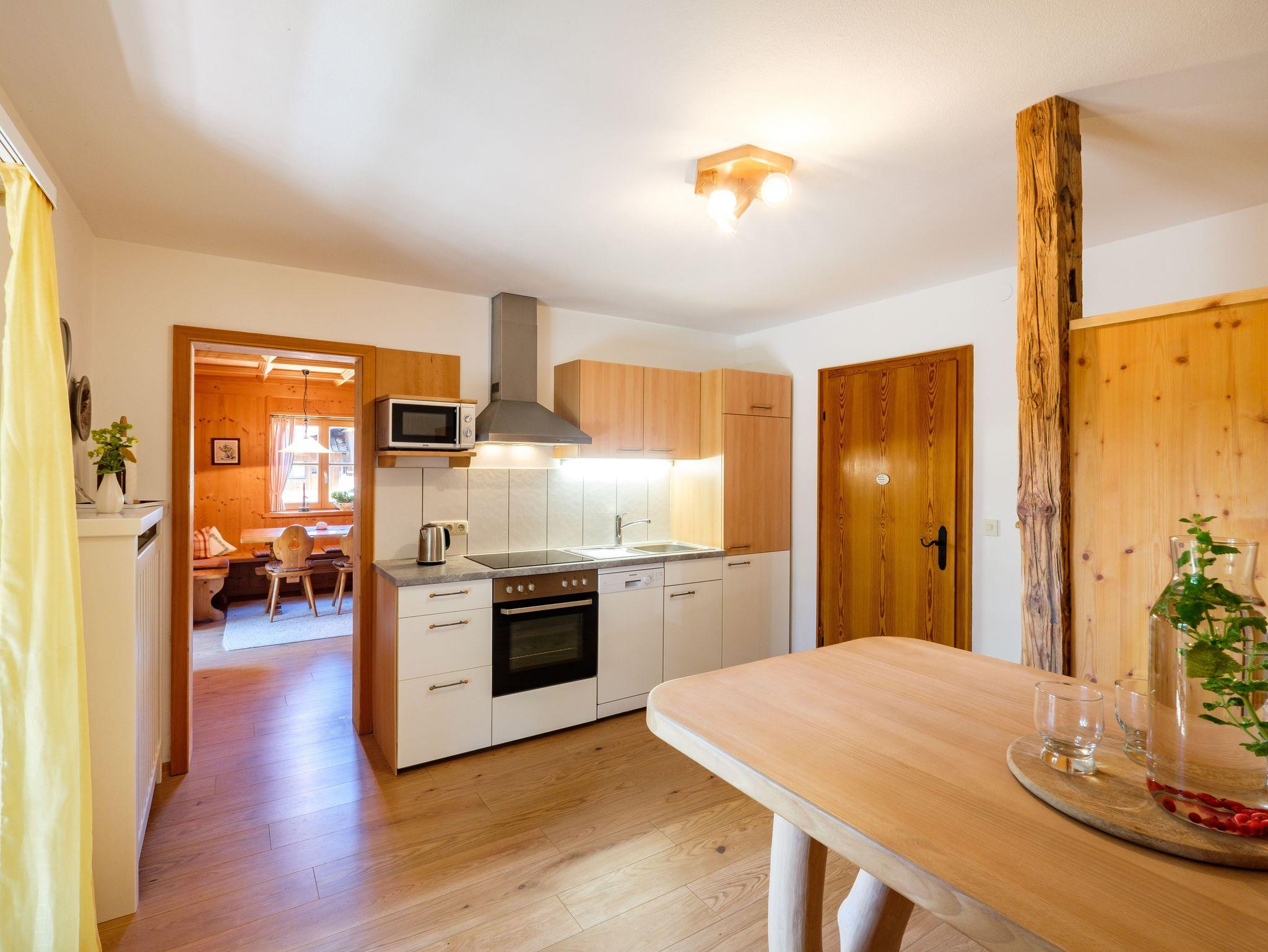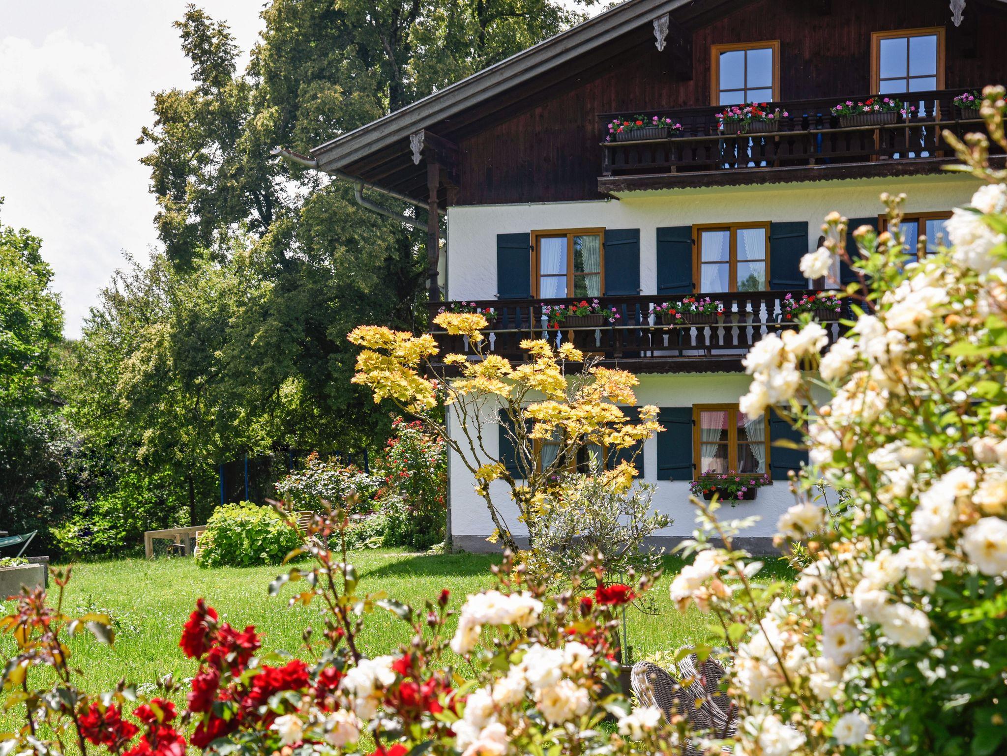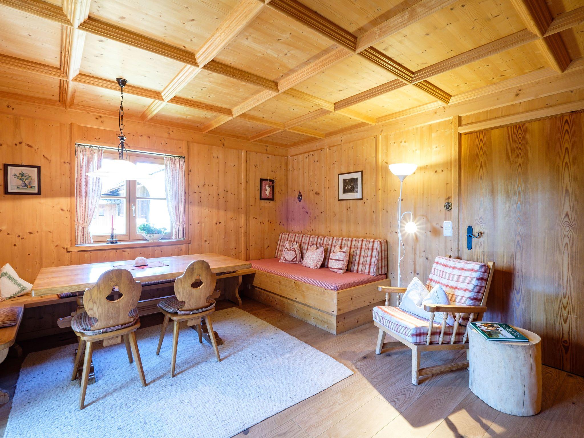 Die konfortabel und gemütlich eingerichtete ****Wohnung hat 2 Balkone mit Sicht auf die umliegenden Wiesen und Berge. In dieser ruhig gelegenen Wohnung können Sie die Sonne vom frühen Morgen bis zum Nachmittag genießen. Der Südbalkon ist überdacht und so geschützt, dass Sie auch an Regentagen die frische Luft und die Ruhe genießen können. Die Wohnung verfügt über ein Schlafzimmer mit Doppelbett und ein festes Zusatzbett, ein Kinderbett kann außerdem zugestellt werden. Das Wohnzimmer ist sehr geräumig und im ländlichen Stil mit großer Essecke und Couch (evtl. Schlafcouch) möbiliert und verbreitet bayrische Gemütlichkeit. In der gut ausgestatteten Küche, erneuert 2023, lädt ein Bistrotisch zum Brotzeitmachen ein.