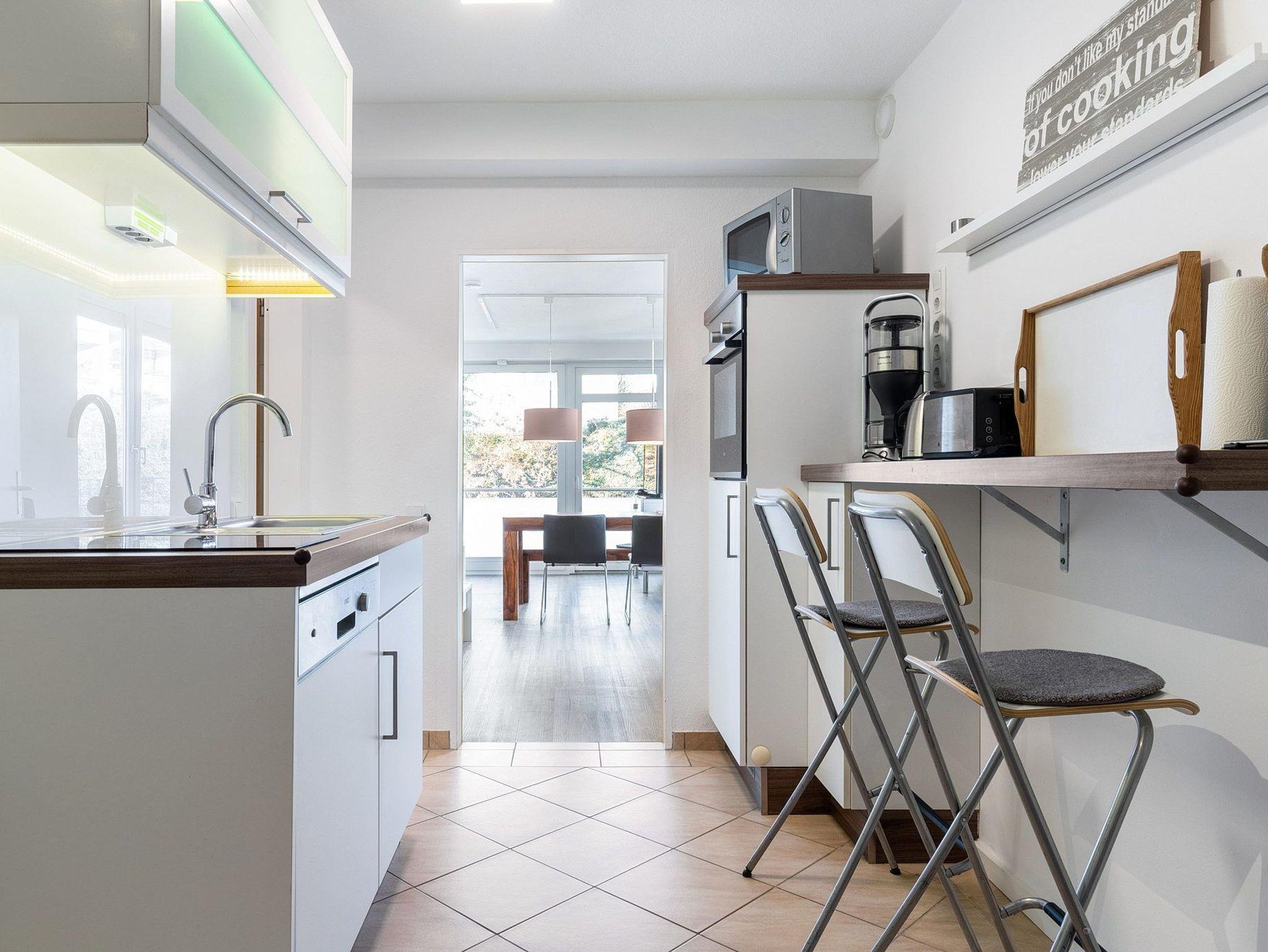 Moderne, komplett eingerichtete Pantryküche mit 2-Platten Cerankochfeld, Backofen, Spülmaschine, Kühlschrank mit kleinem 3-Sterne Gefrierfach, Mikrowelle, Toaster, Kaffeemaschine und Wasserkocher.