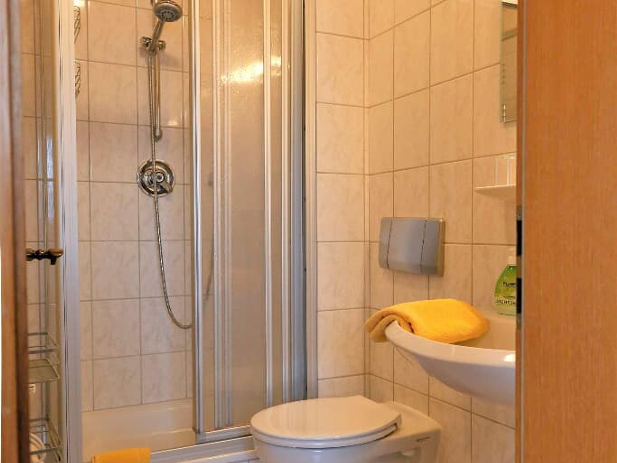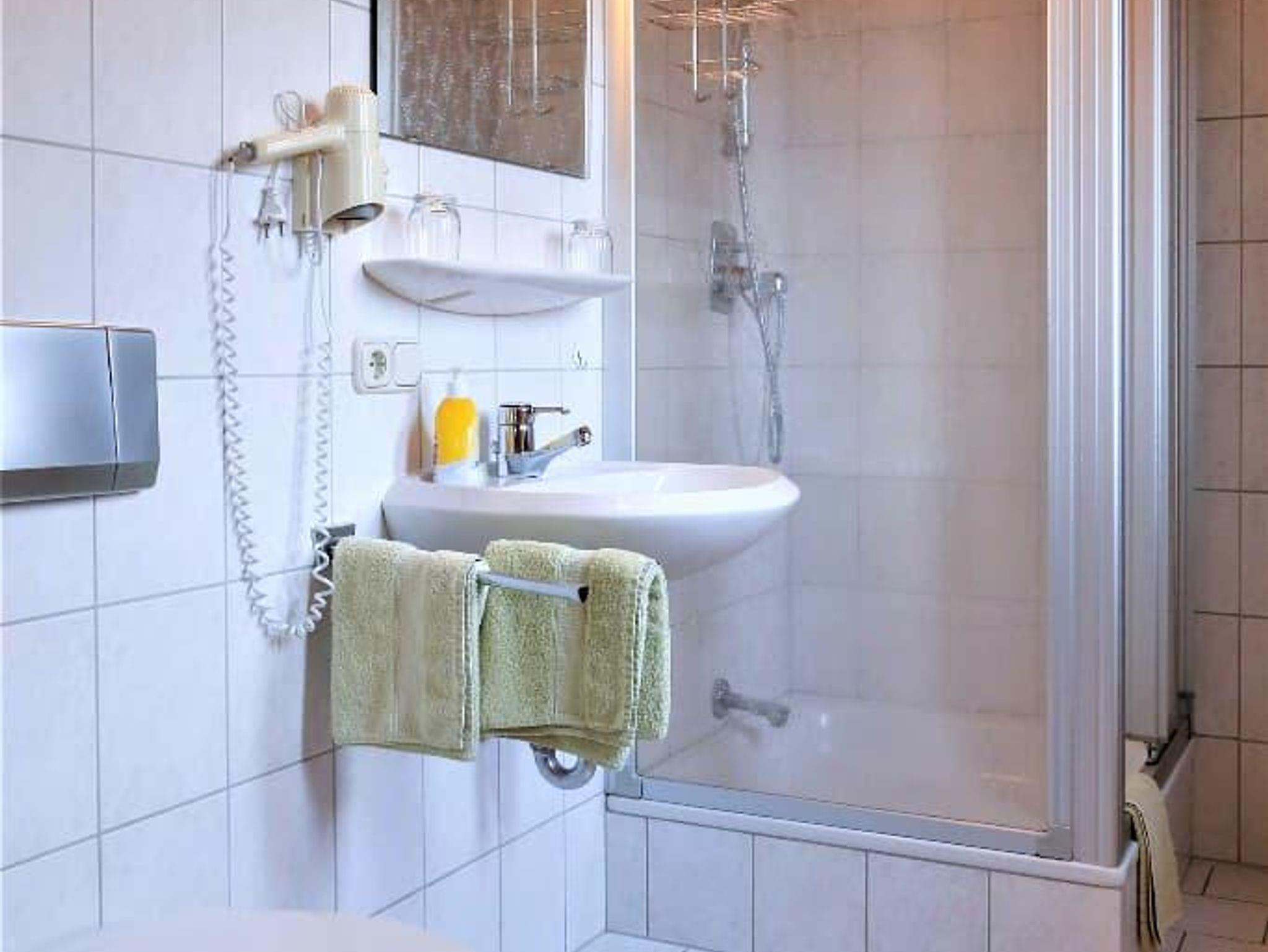 Doppelzimmer mit Dusche/WC und TV. WLAN kostenfrei. Der großzügige Balkon mit Sitzgelegenheit bietet eine schöne Aussicht auf den Garten mit Pool.