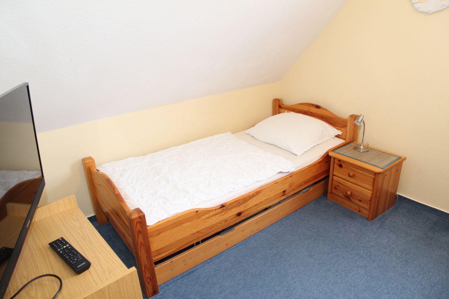 Oben befinden sich 2 Schlafräume (Kinderzimmer mit 2tem Fernseher) und ein Duschbad mit WC.