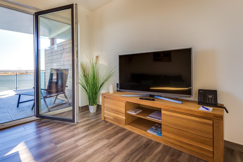 Die großzügigen Ferien-Appartements sind jeweils mit einem Schlafzimmer (mit einem Doppelbett 160 x 200 cm), einem Badezimmer mit Dusche/WC und einem offen großzügigen Wohn-/Essbereich ausgestattet. Die komplett eingerichtete Einbauküche sowie die bequeme Wohnlandschaft und der angrenzende Balkon mit Hafenblick runden das Wohlfühlangebot ab.