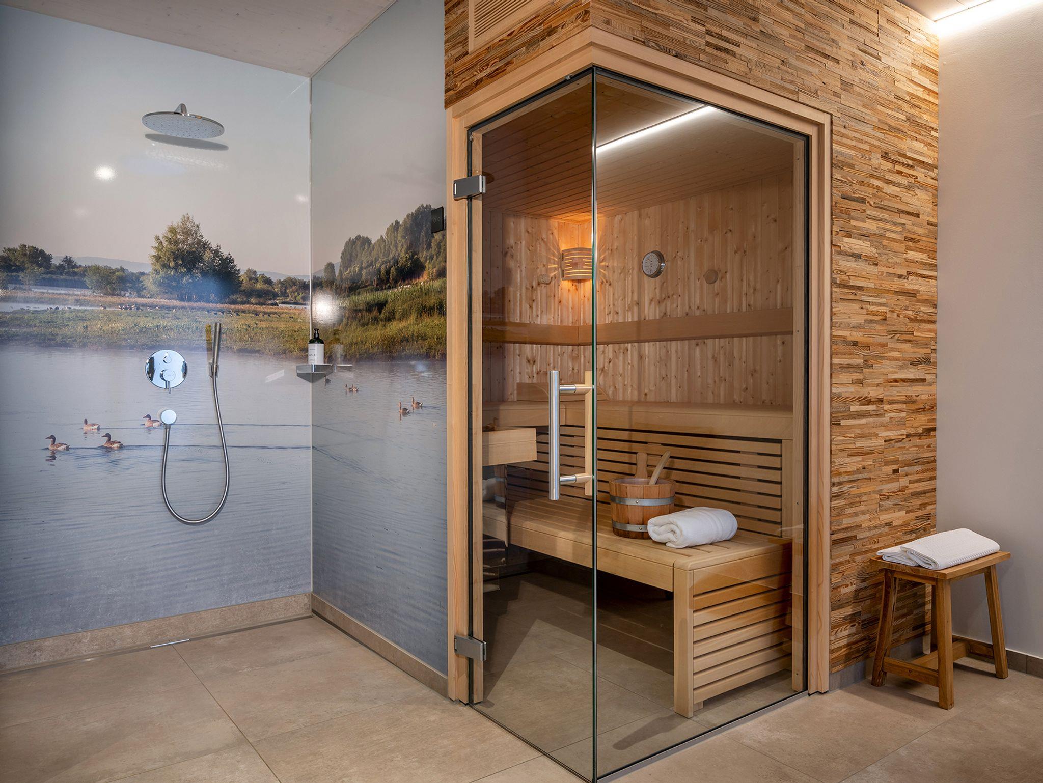 - Saunabreich im EG mit Dusche, Liegen und Dirketzugang nach außen zu einem kleinen sichtgeschützten Sitzbereich
