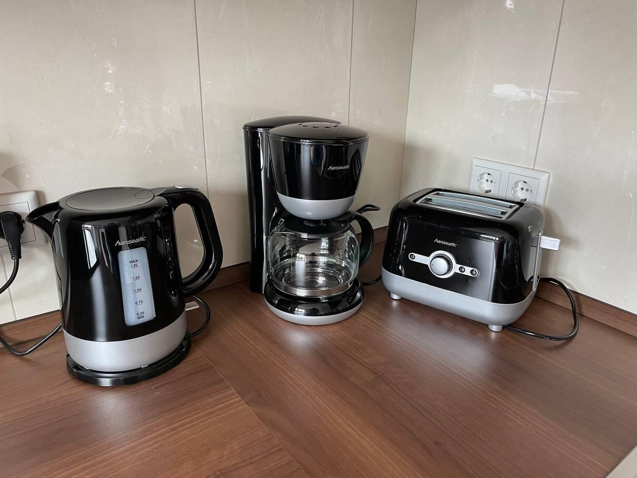Küche mit Herd, Backofen, Küchenutensilien, Spülmaschine, Kühlschrank + Gefrierschrank, Wasserkocher, Kaffeemaschine, Toaster