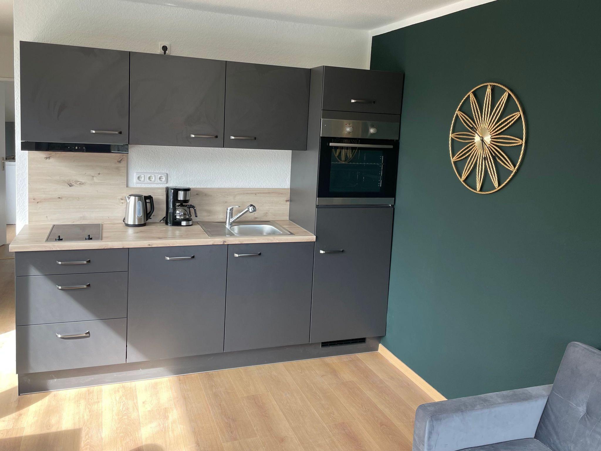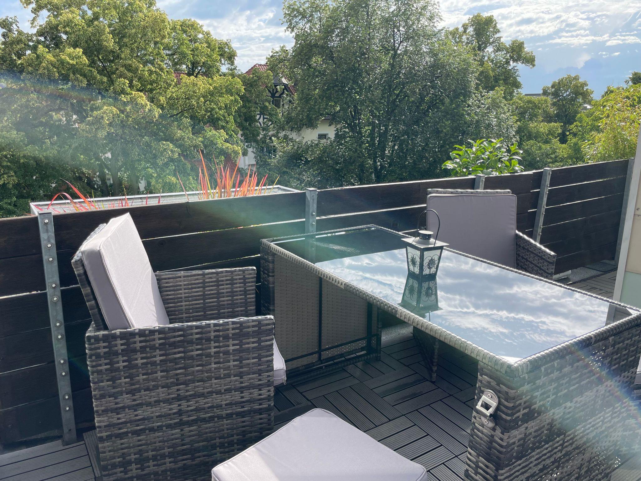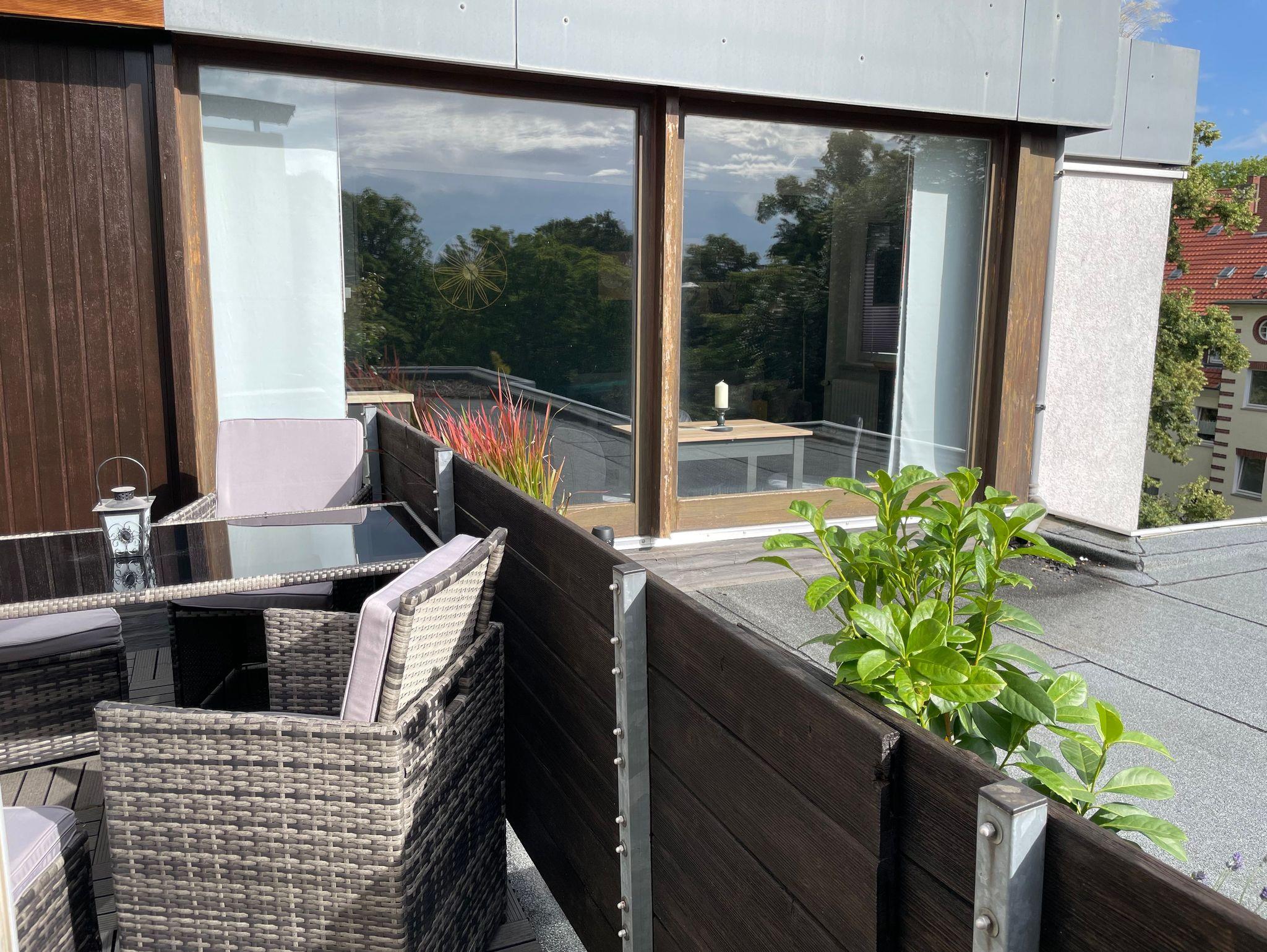 Das sonnendurchflutete Wohnzimmer mit Schlafsofa, TV, Essbereich und Küchenzeile bietet einen weiten Blick in die Baumwipfel. Die Küche ist mit Backofen, Geschirrspüler, 2-Platten-Kochfeld und Kochutensilien ausgestattet. Auf der Dachterrasse stehen Ihnen Gartenmöbel zur Verfügung.