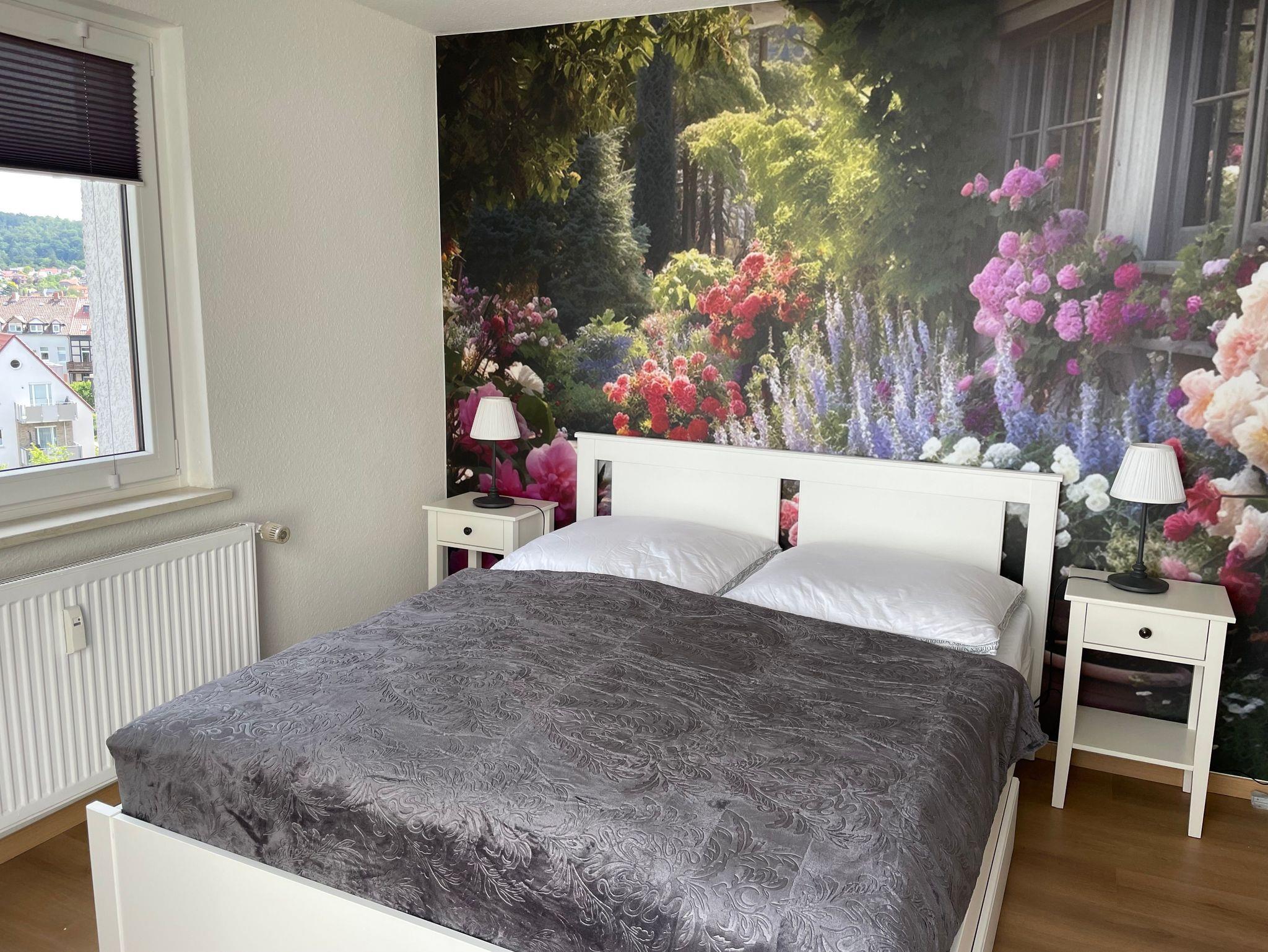 Vom Schlafzimmer haben Sie einen malerischen Ausblick über Hameln bis zum Weserbergland. Das Schlafzimmer verfügt über ein Doppelbett, ein Kleiderschrank, Nachttische und ein TV.