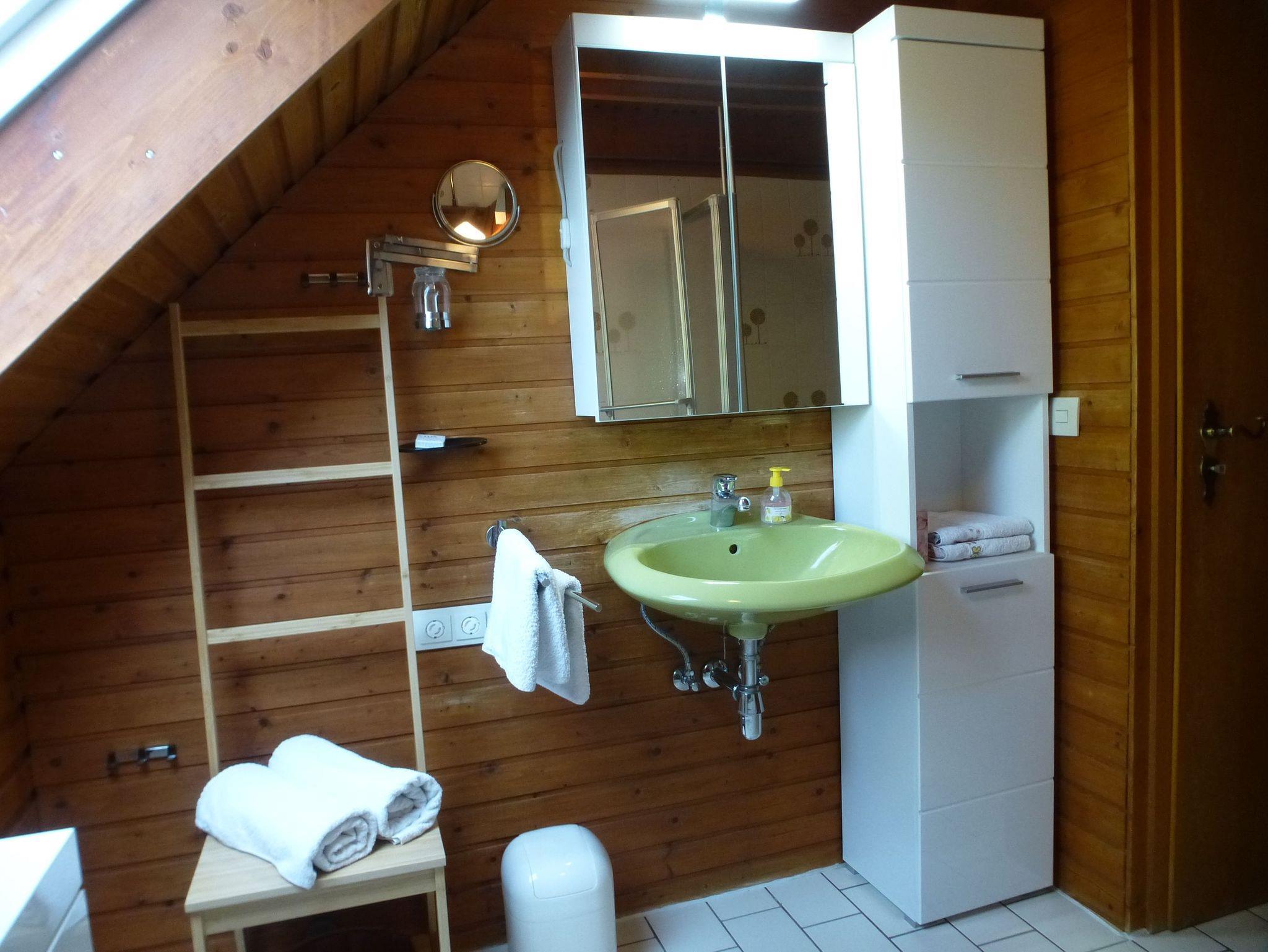 Auf der anderen Seite des Flures gelangen Sie ins Badezimmer mit Waschbecken, WC und Badewanne mit Dusche. Zum Duschen können Sie eine feste Abtrennung um die Wanne ziehen. Genügend Handtücher, Föhn, Vergrößerungsspiegel, Kosmetiktücher und Hand- und Duschseifen gehören zum Service. Ein Dachflächenfenster sorgt für frische Luft.