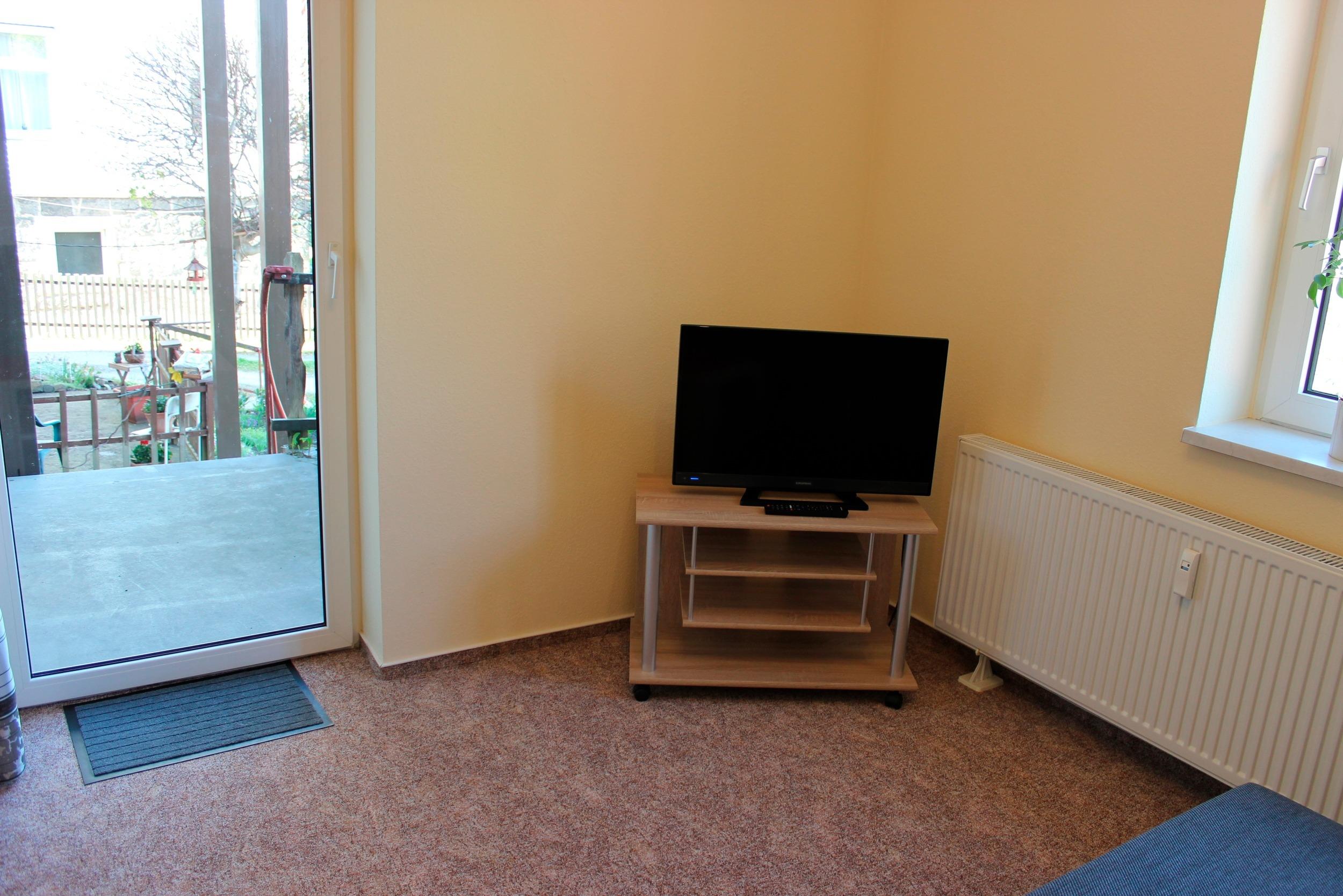 Im Wohnzimmer steht eine Klappcouch als Schlafmöglichkeit zur Verfügung, eine Kommode und ein moderner LCD – TV mit zahlreichen Kabelkanälen.