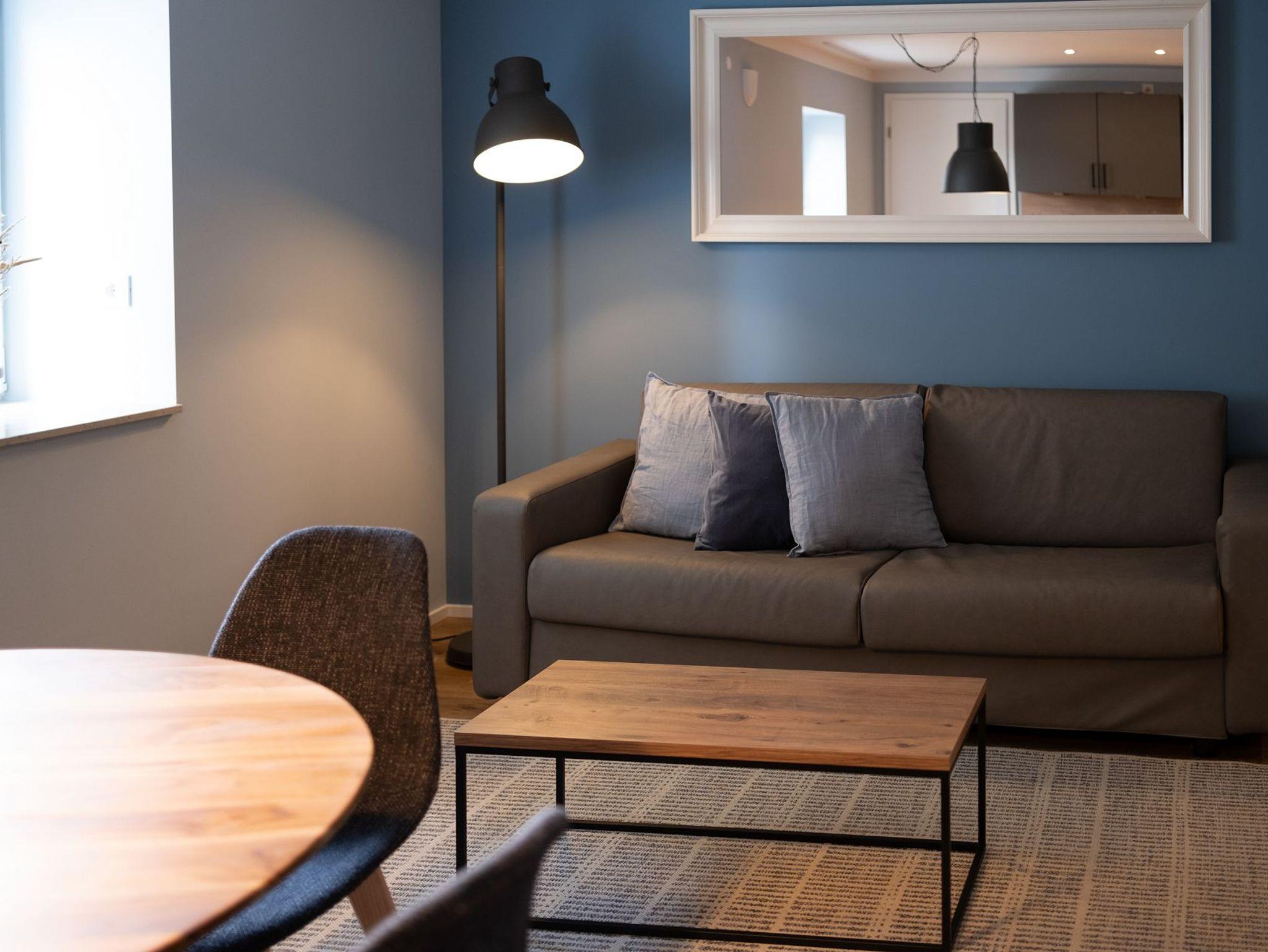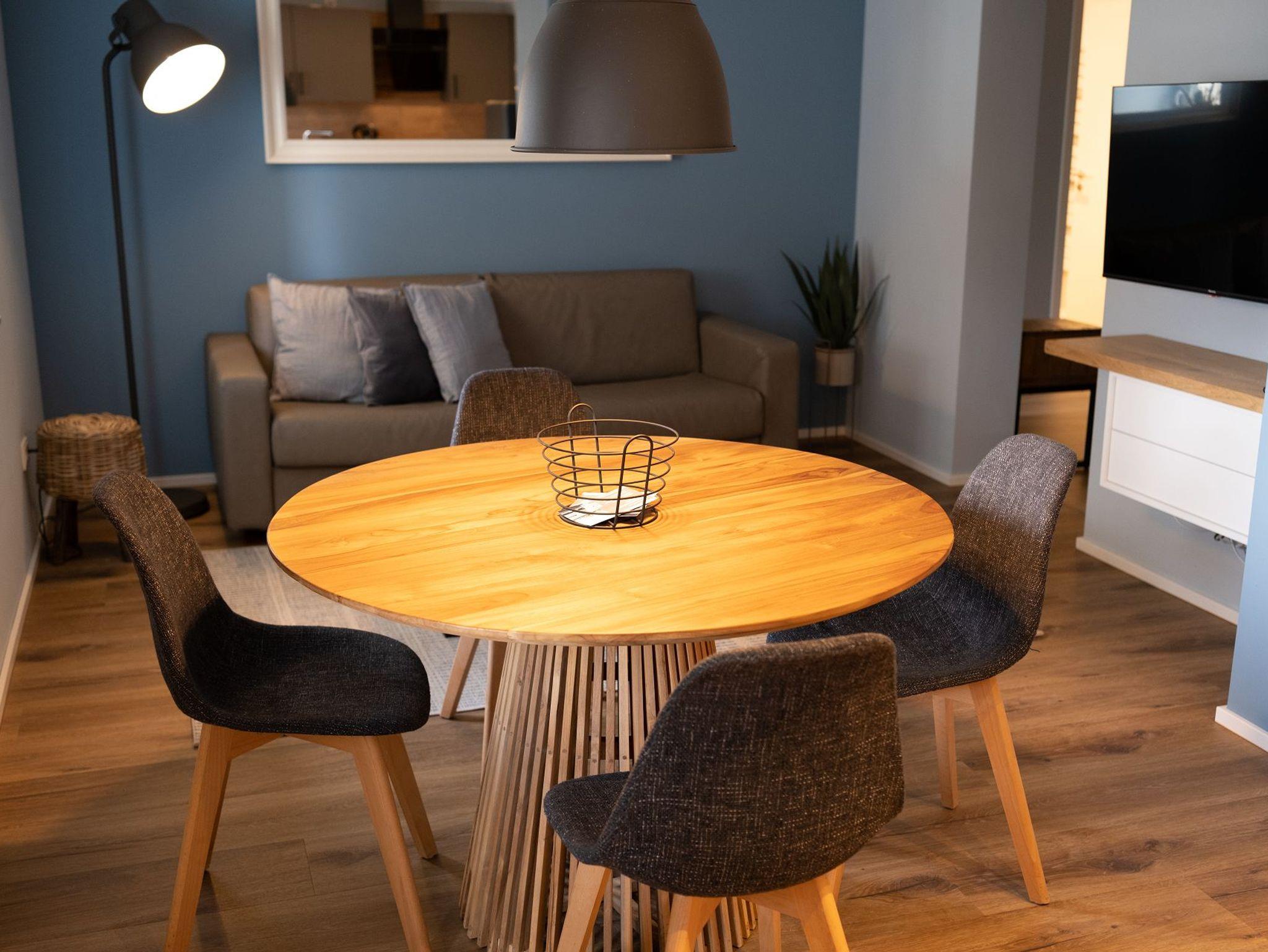 - Ein Wohn-/Esszimmer mit einer Schlafcouch (140x200) und einem 43-Zoll Smart TV