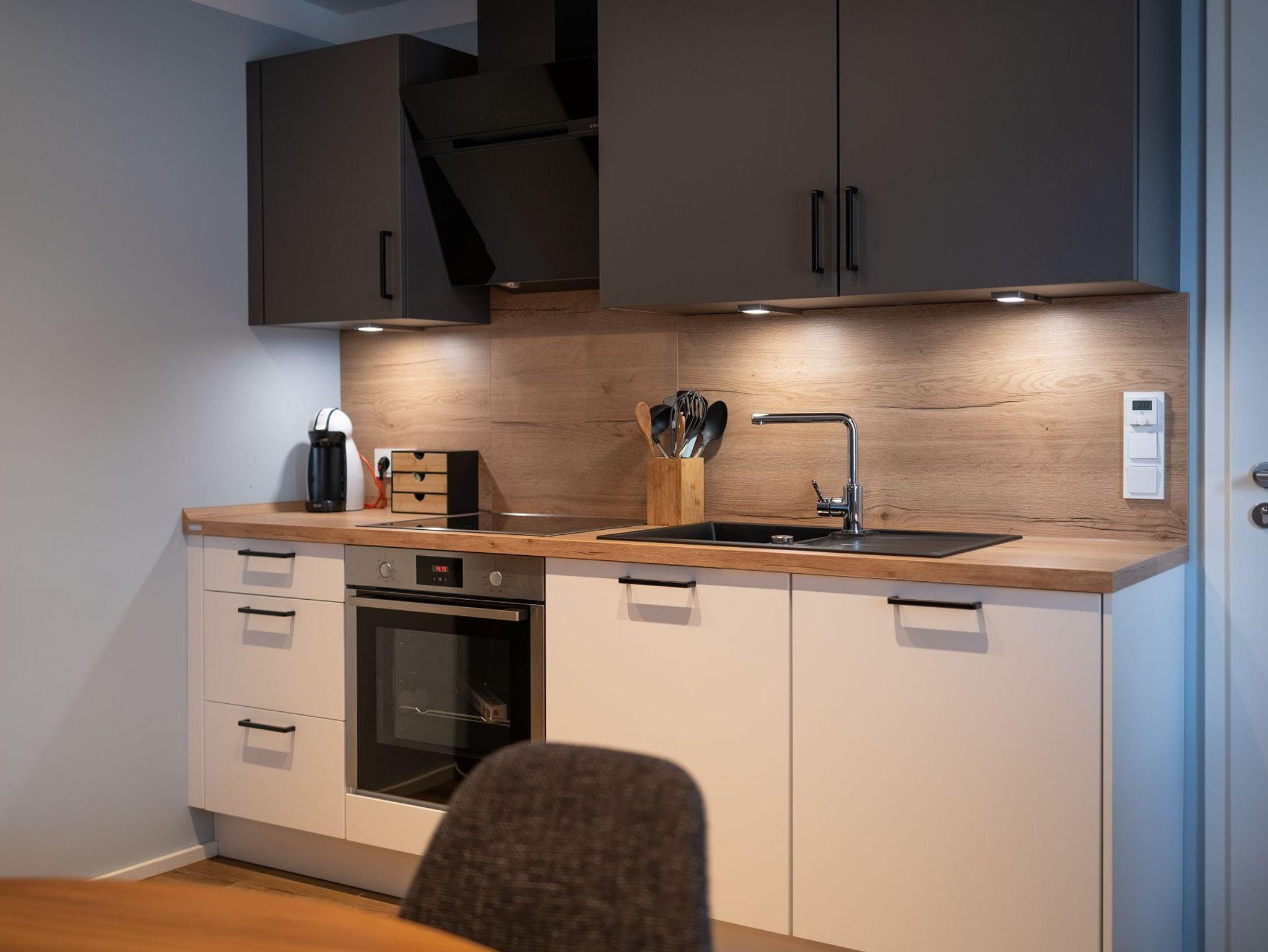 - Eine vollausgestattete Küche mit Backofen, Herd und Spülmaschine