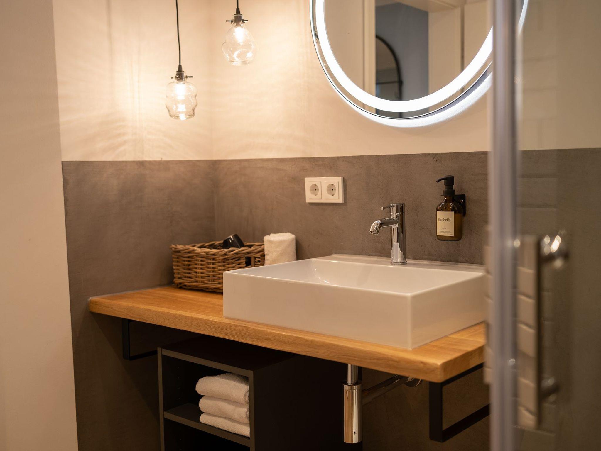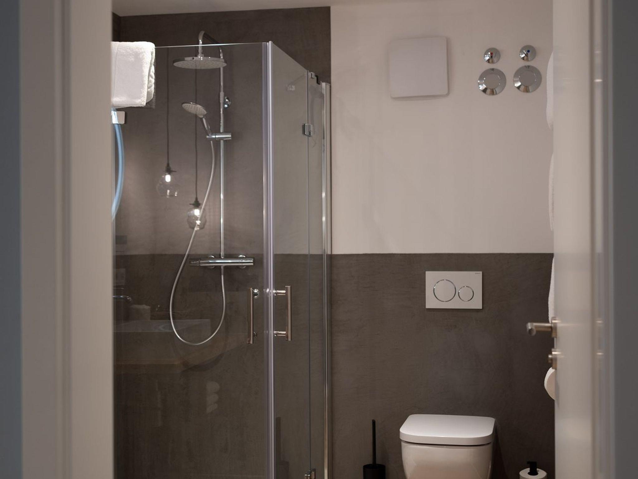 Das Schlafzimmer ist mit einem gemütlichen Boxspringbett ausgestattet, während das Badezimmer stilvoll eingerichtet und mit einer großzügigen Dusche sowie einem WC ausgestattet ist.