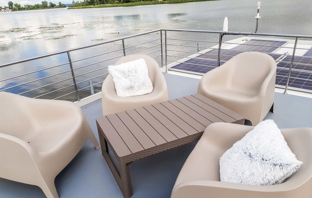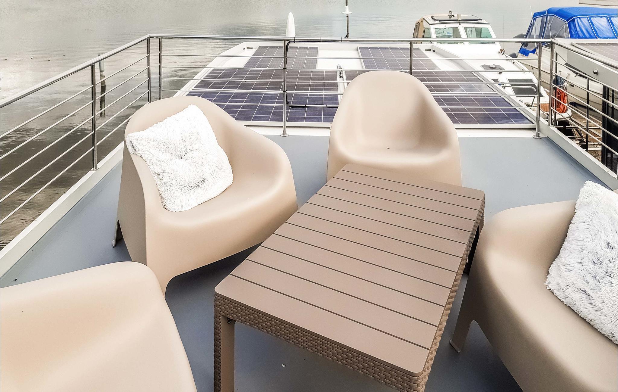 Auf dem Hausboot können bis zu 4 Personen unterkommen. Es ist ausgestattet mit einer wandelbaren Schlafkabine, WC/ Waschbecken, Dusche, Minipantry mit Kühlschrank, Kochfeld, ausziehbares Schlafsofa im Salon, Bluetooth-Radio und möblierter Dachterrasse. Genießen Sie den Blick auf das Wasser von der oberen oder Bugterrasse aus. Hier können Sie abschalten, die Sonne genießen oder gemeinsame Mahlzeiten einnehmen. Große Bug- und Heckschiebetüren vermitteln unendliche Freiheit auf dem Wasser.