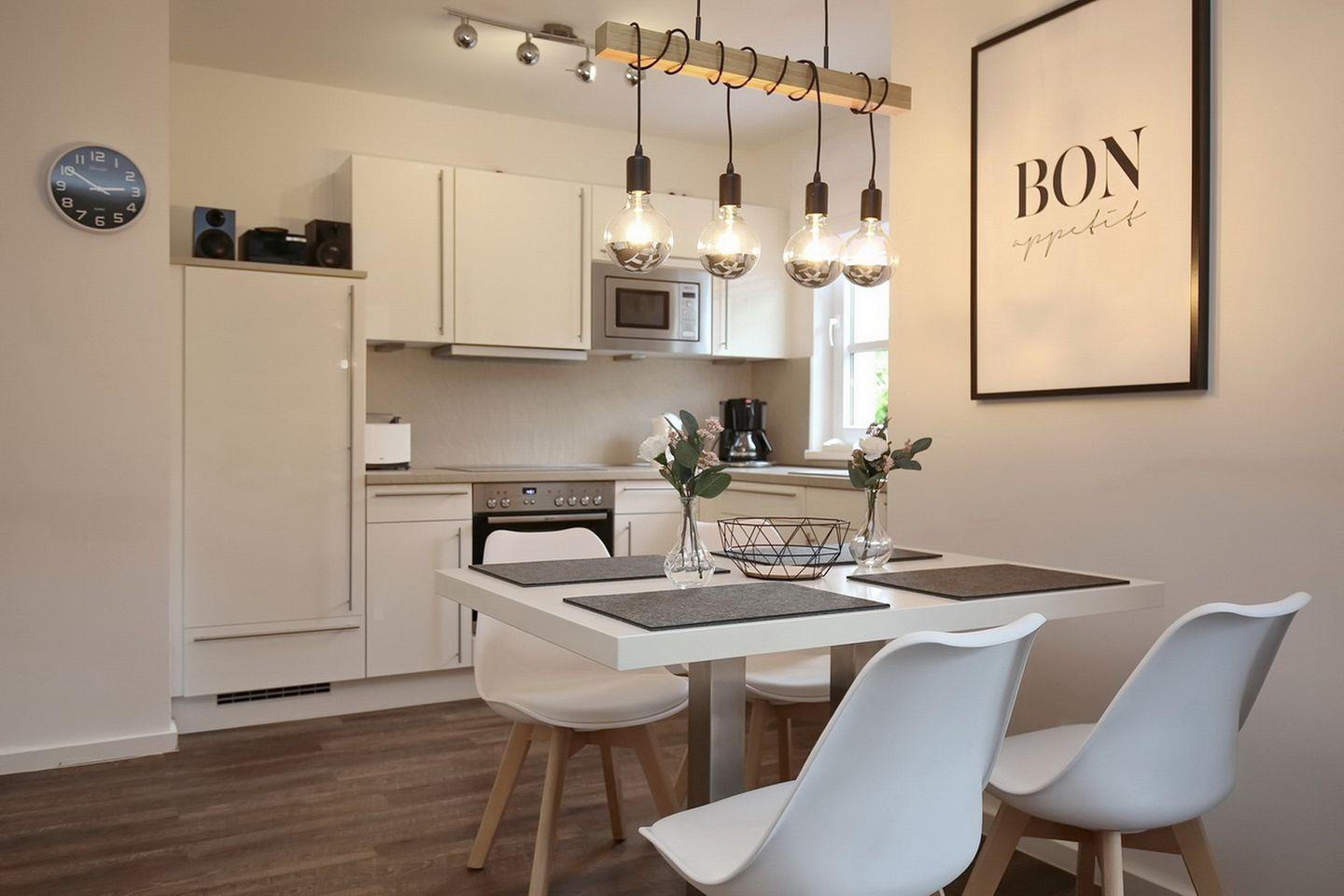 Der Essbereich ist mit einem Tisch und 4 Stühlen ausgestattet. Die exklusive Küchenzeile bietet alles, was du brauchst: ein Cerankochfeld (4 Platten), einen Backofen, eine Mikrowelle, einen Geschirrspüler und einen Kühlschrank mit Gefrierfach. Außerdem gibt es im Küchenbereich eine Stereoanlage (mit Auxanschluss, CD-Player).