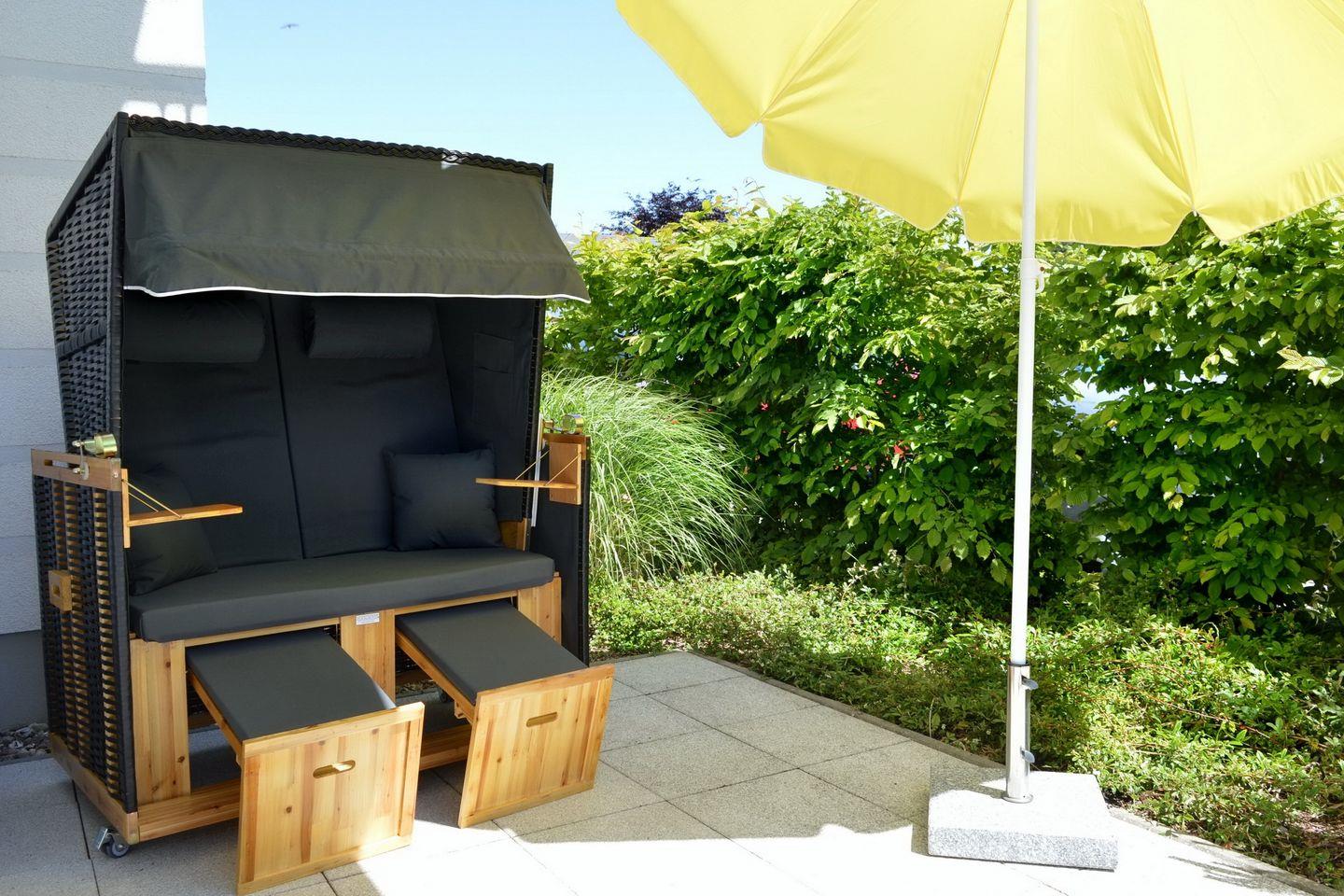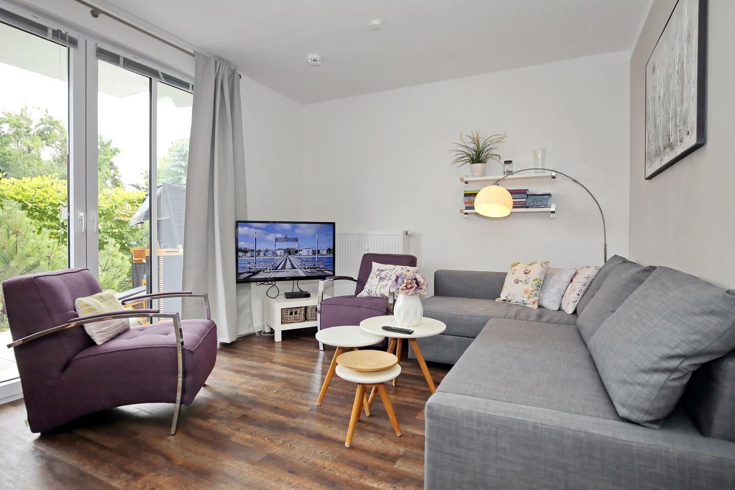 Die Wohnung befindet sich im Erdgeschoss auf der Südostseite des Hauses und hat eine große Terrasse mit Strandkorb. Der Boden ist mit Designbelag ausgelegt. Im offenen Wohnbereich findest du eine moderne Doppelschlafcouch (140 cm x 200 cm), auf der bequem 2 Personen schlafen können. Ausgestattet mit passenden Sesseln, Couchtisch, Flatscreen-TV, Blu-Ray-Player, DVD-Player und einer Auswahl an DVDs, lädt die Wohnung zu gemütlichen Filmabenden ein.
