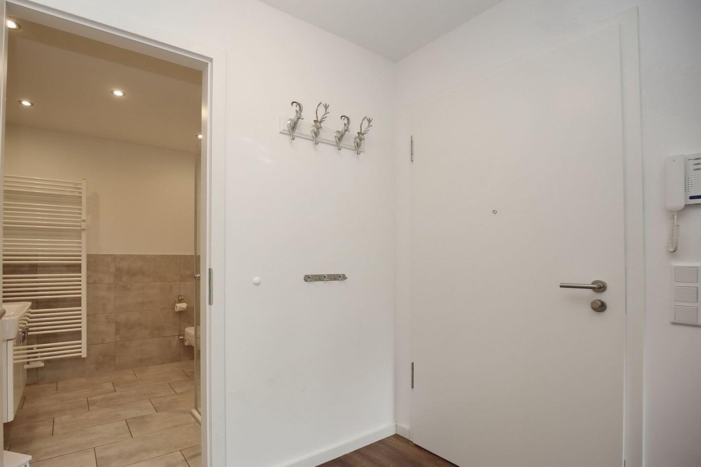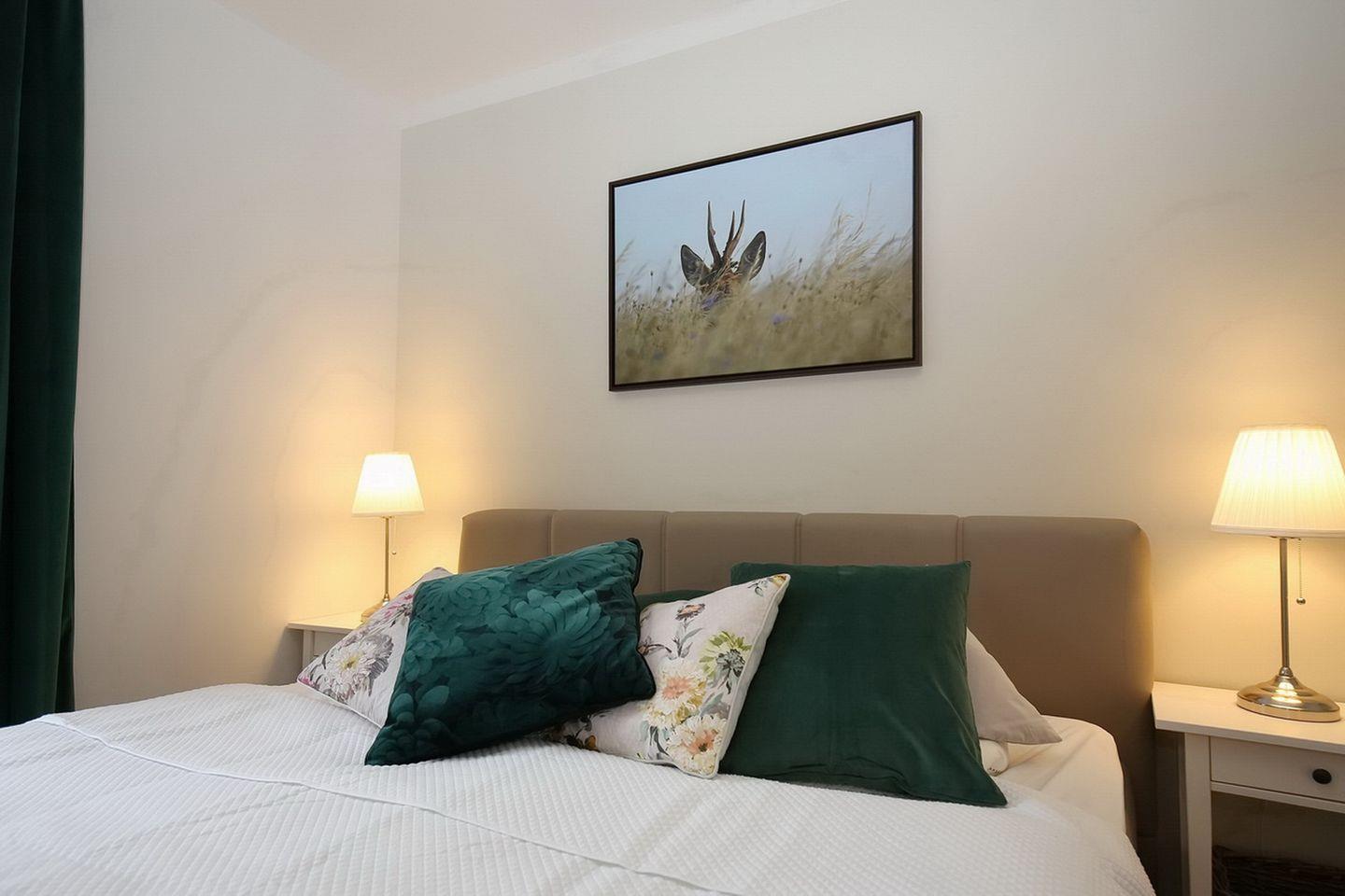 Im Schlafzimmer steht dir ein komfortables Boxspringbett mit zwei Matratzen und einer Auflage (180 cm x 200 cm) zur Verfügung. Der angrenzende begehbare Kleiderschrank bietet ausreichend Stauraum für deine Sachen. Natürlich gehört auch ein Duschbad mit einer großzügigen Dusche zur Wohnung.