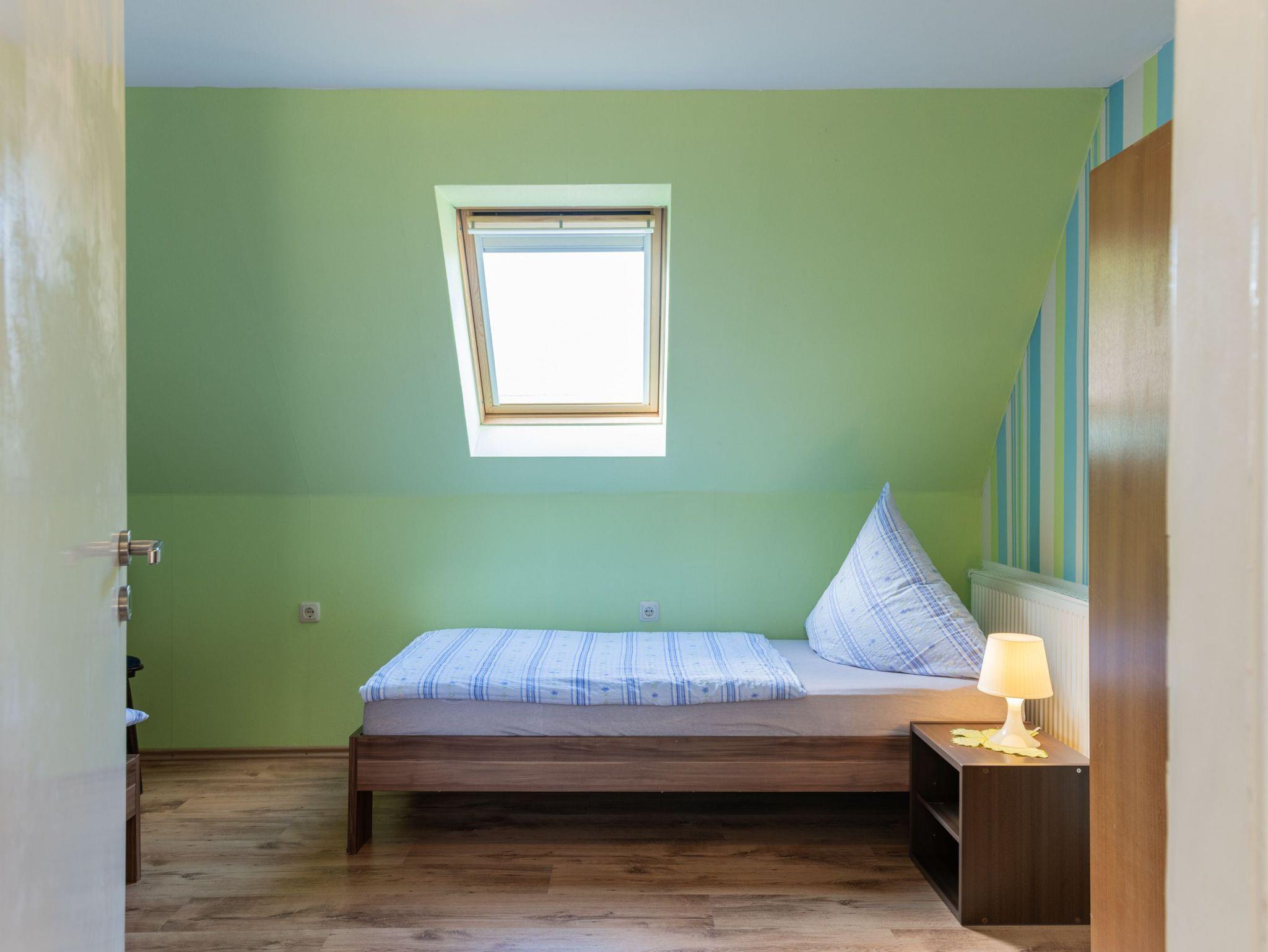 Schlafzimmer 2: Zwei Einzelbetten (100x200 cm) die wahlweise getrennt oder zusammengestellt werden können, und ebenfalls ein 2-türiger Kleiderschrank.
