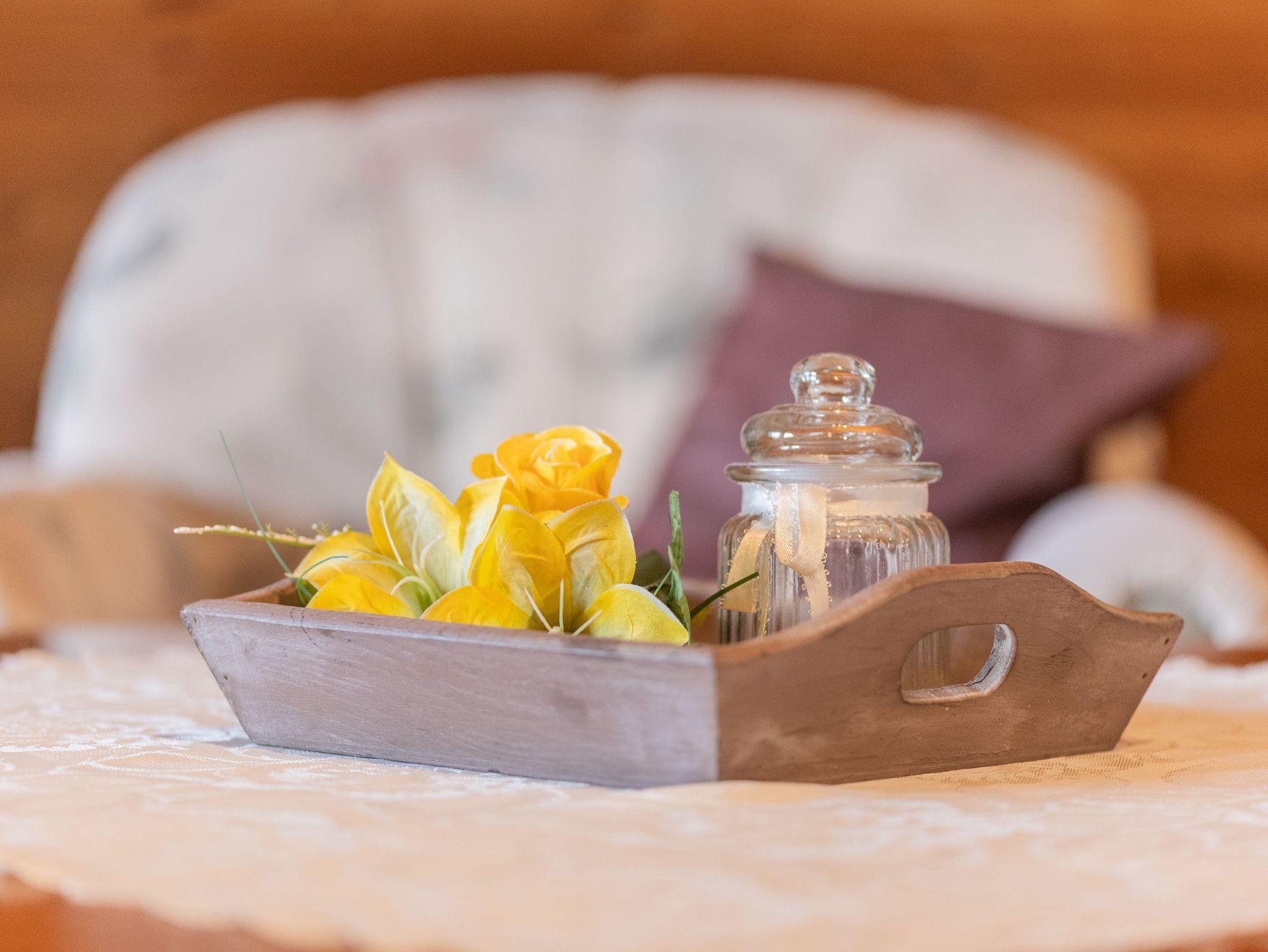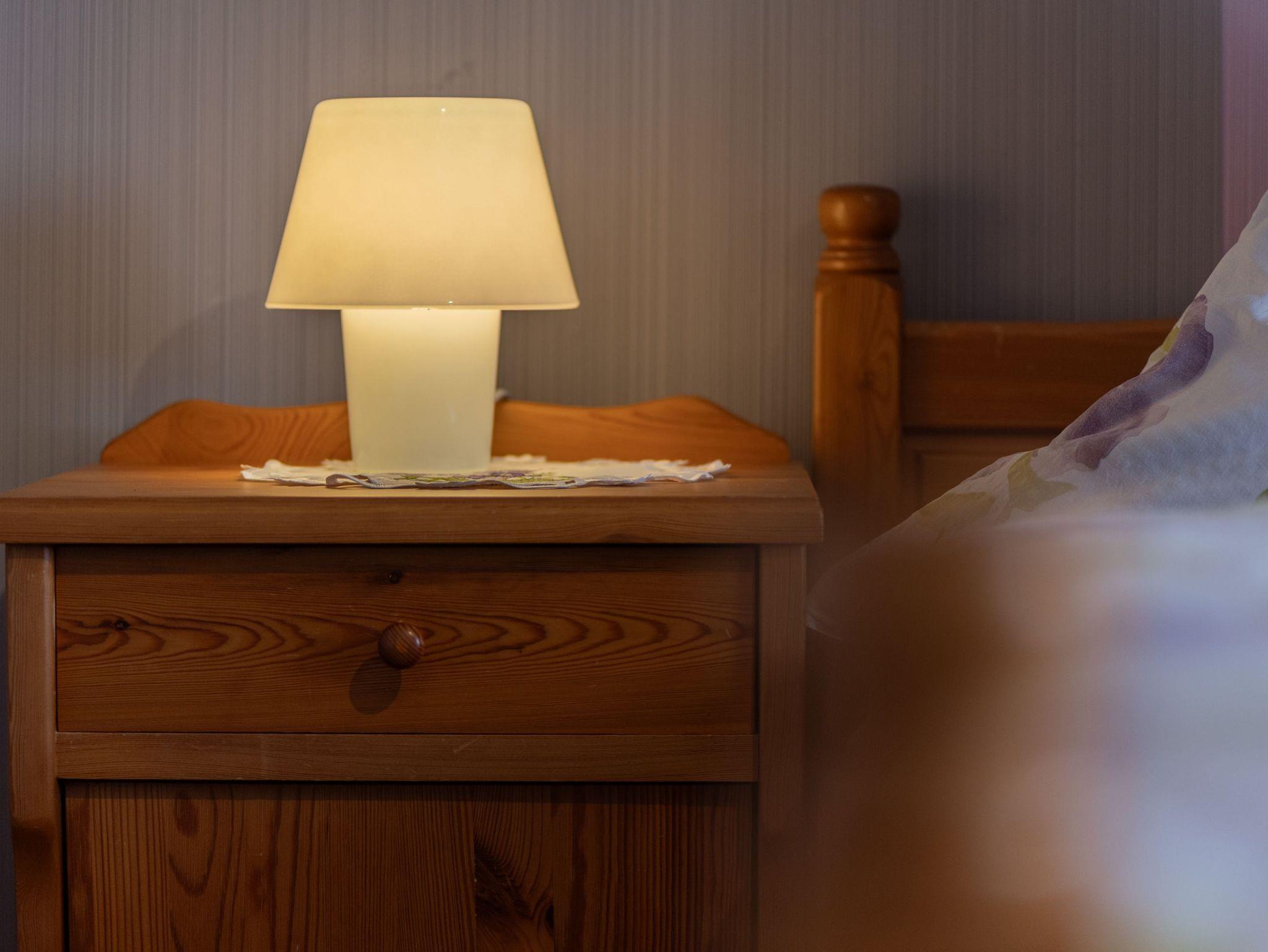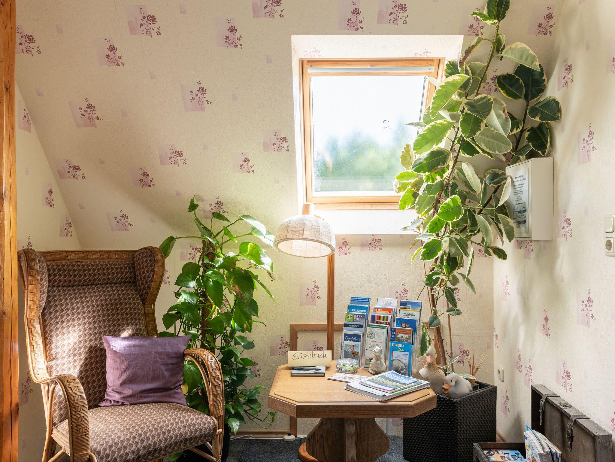 Als Vorzimmer zu den Schlafräumen befindet sich ein Lesezimmer, ausgestattet mit einer Leselampe, Hörnstuhl, Bücher und Prospektmaterial.