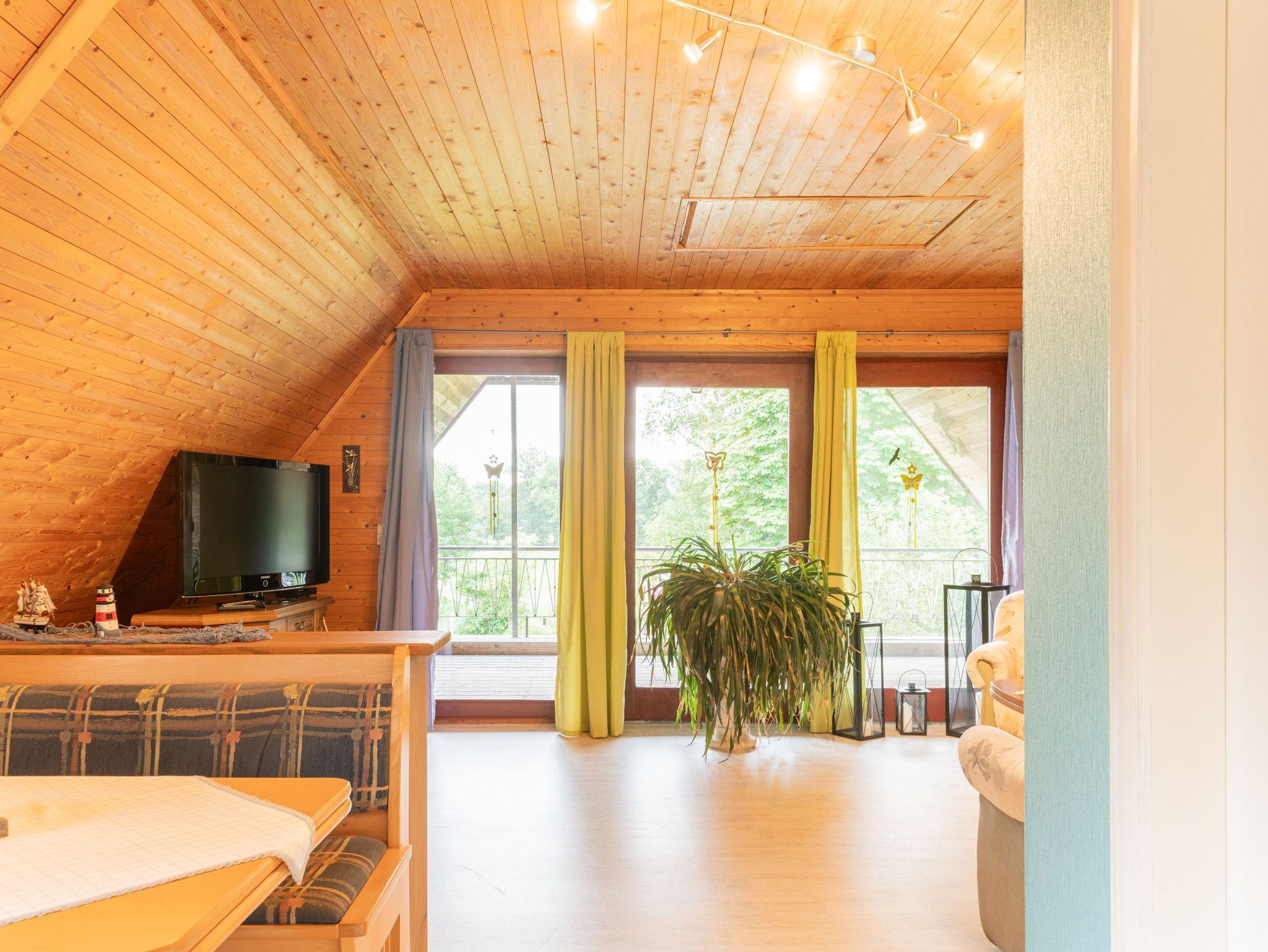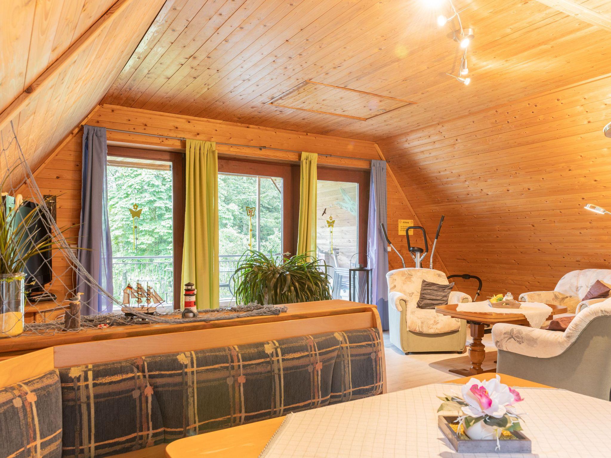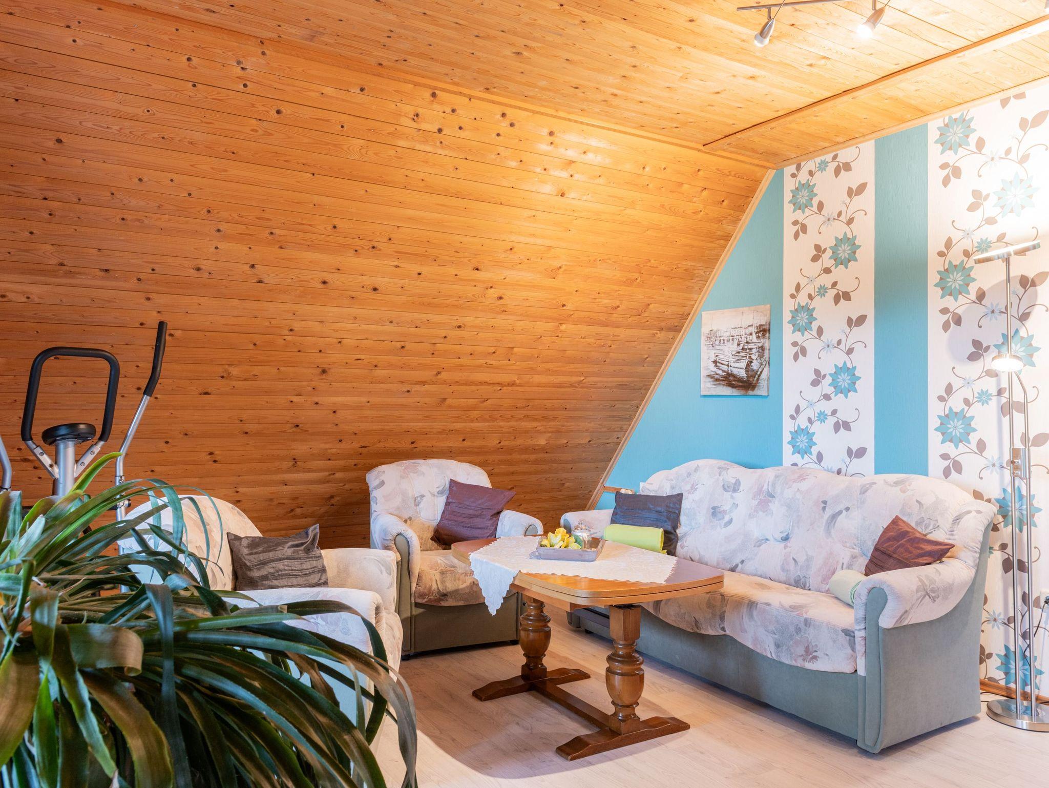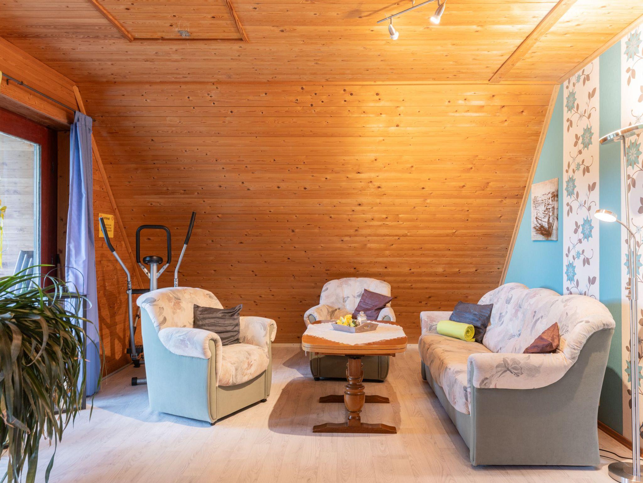 Das Wohn- u. Esszimmer ist ausgestattet mit SAT-TV. Die Esszimmerecke ist mit einem ausziehbarem Tisch, Eckbank und 2 Stühlen eingerichtet. Ein Hochstuhl ist hinter der Eckbank vorhanden und kann mühelos aufgebaut werden. Der Wohnbereich ist mit einem großen Tisch, Couch und 2 Sessel ausgestattet. Hier können die zu Verfügung stehenden Sportgeräte genutzt werden. Ebenfalls befindet sich hier ein gut gefülltes Bücherregal mit unterschiedlichen Themen und in der Kommode sind einige Gesellschaftsspiele untergebracht. Badezimmer mit Dusche/Eckeinstieg (100x100 cm) und WC.