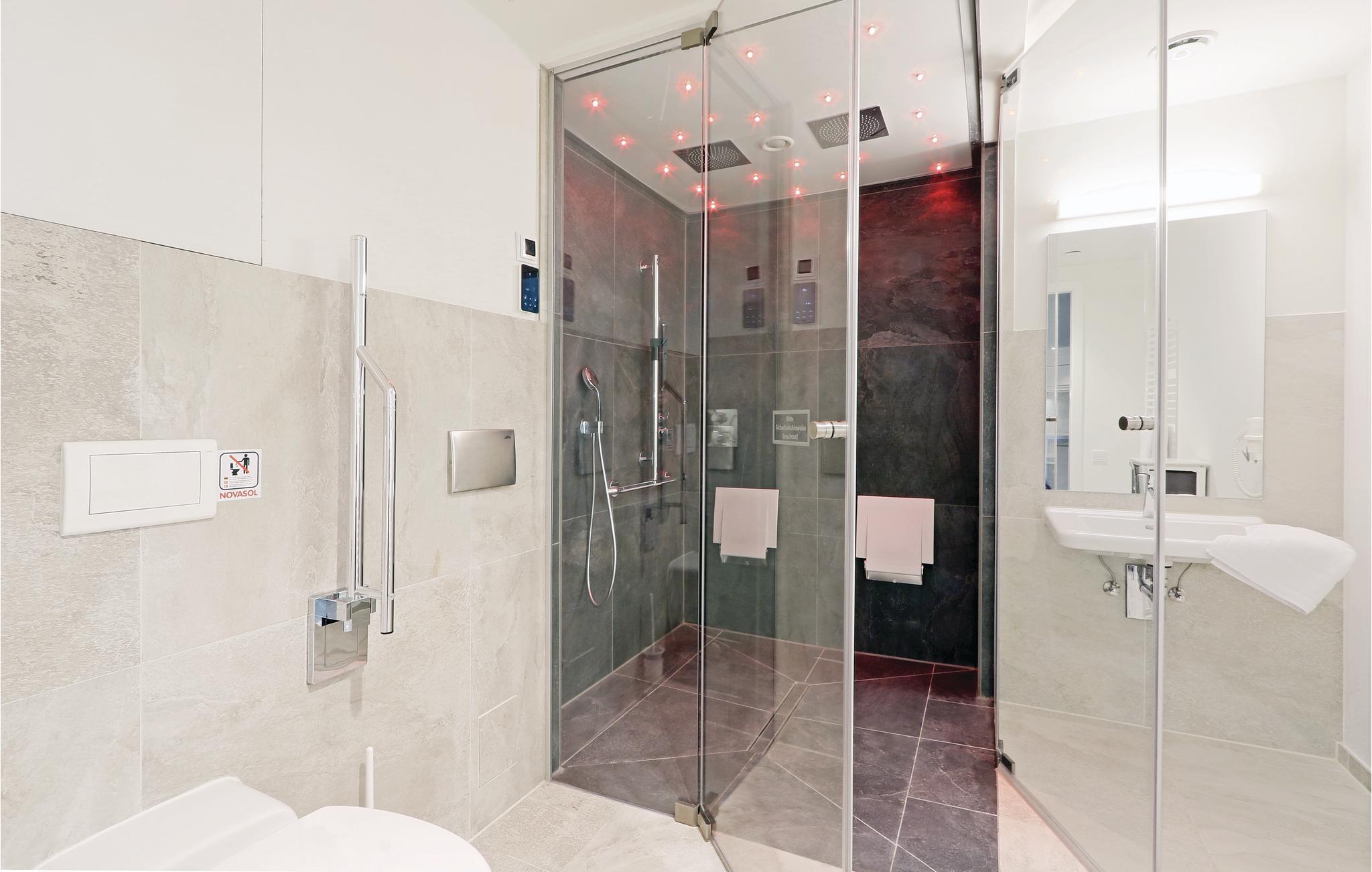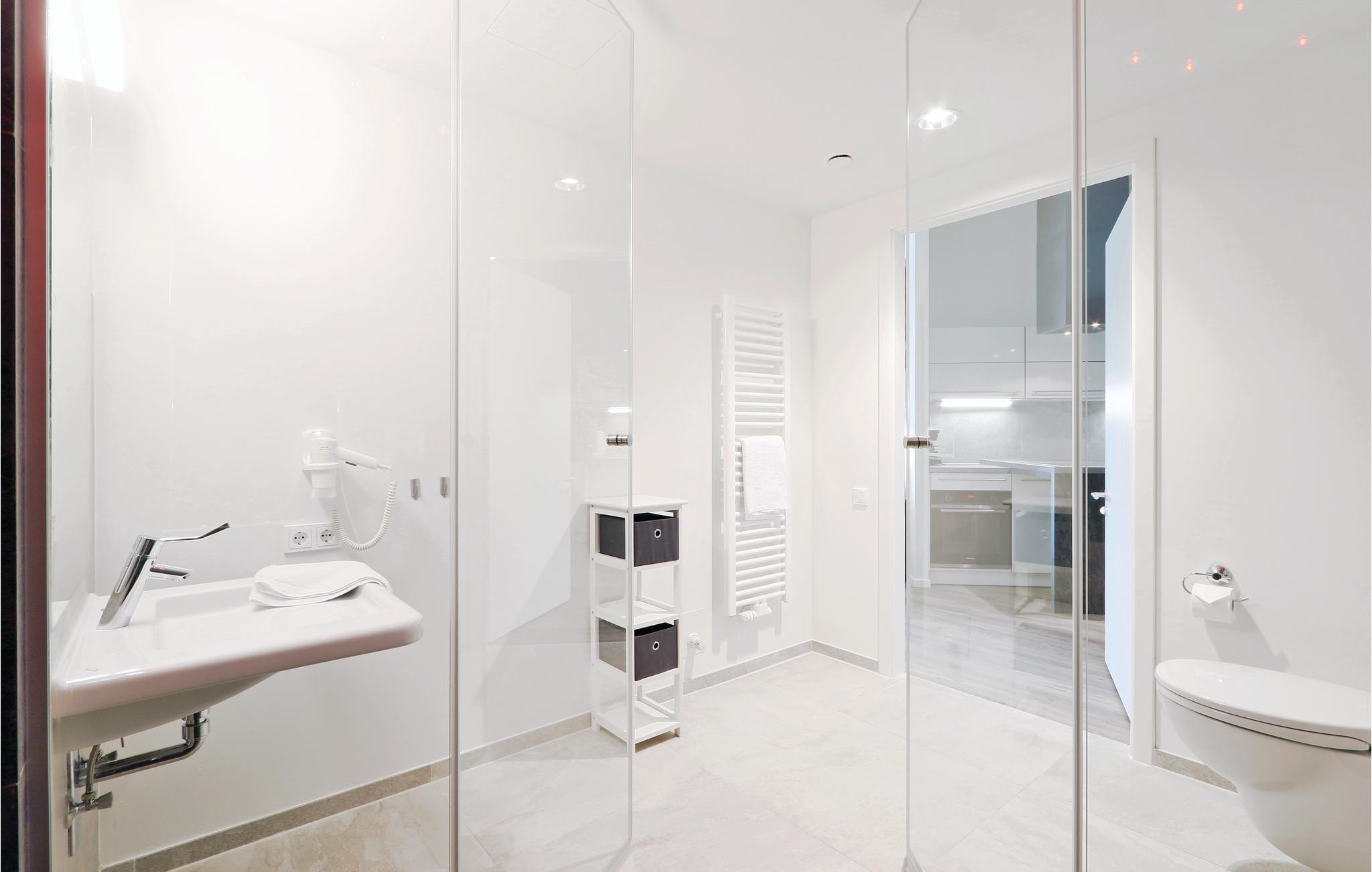 Im modernen Badezimmer befindet sich das Highlight Ihrer Wohnung: die großzügige Regendusche. Hier können Sie sich nach einem langen Ostseespaziergang eine ausgiebige Dusche genießen.