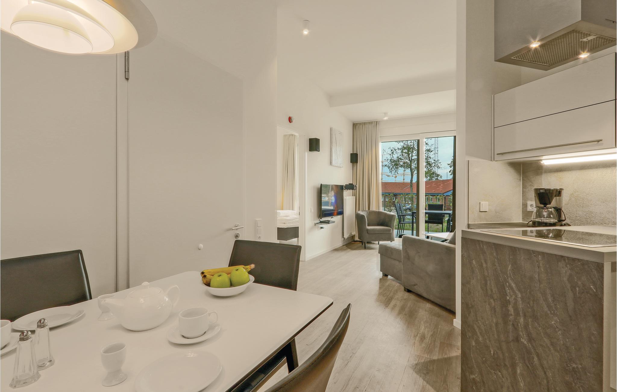 Die moderne Küchenzeile bietet ausreichend Platz zum Kochen und ist mit hochwertigen Markengeräten ausgestattet. Hier finden Kaffeeliebhaber eine Nespresso-Maschine (Kapseln bitte selbst mitbringen), sowie Thermoskanne und Handfilter zum Selbstbrühen, falls Sie doch den klassischen Filterkaffee bevorzugen. Auf der Terrasse mit kleiner Grünfläche können Sie die frische Ostseeluft genießen oder gemeinsame Mahlzeiten mit der Familie einnehmen. Von der Terrasse aus können Sie auch immer mal wieder einen Blick auf die Travemündung und die vorbeifahrenden großen Fähren erhaschen.